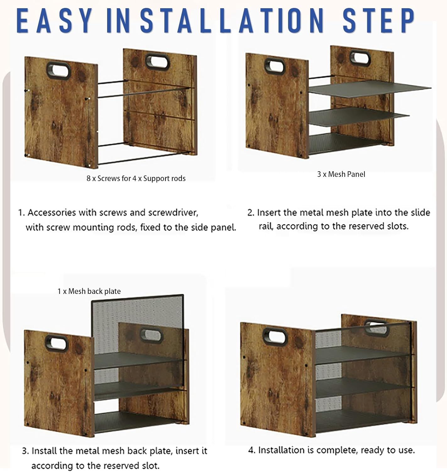 - 【Paper Tray Organzier】 Features 3 tier paper tray for organizing papers, printing papers, copy paper, files, documents, as well as storing office supplies like calculators, pencil cases, alarm clocks, and desk calendars. The 3-tier desktop shelf is a essential storage helper for those who have office desk storage. After receiving and opening the box, the box is equipped with screws inside, only 3 steps to install desk organzier according to the illustration, a few minutes can be installed, the screws reserved screw holes are easy to align, metal mesh partitions reserved slots, easy to insert.