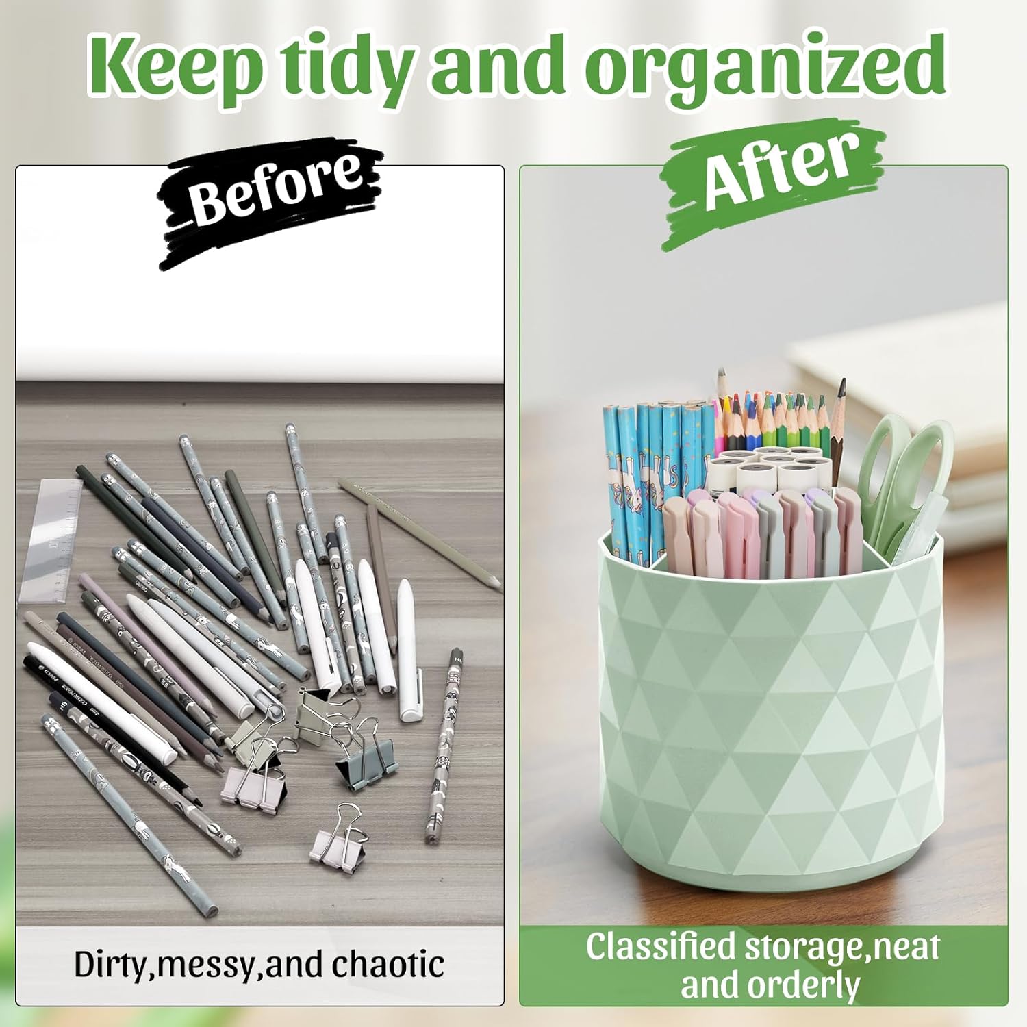 - Versatile Functionality:In addition to being a stationery organizer,desk pencil holder can also store other art caddy such as art supplies,cosmetics,or even small art supplies organizer.This versatile design makes green desk accessories a must-have tool on your work desk,providing more possibilities for your life and work.
