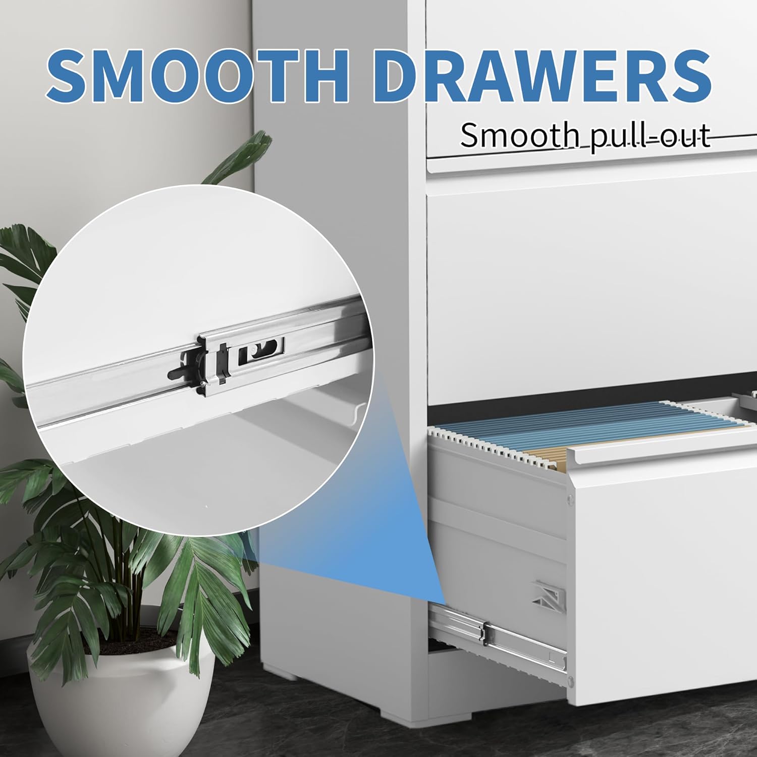 - ăSturdy and Functională The 3 drawer file cabinet size:D15.75"*W35.43"*H52.28", drawer size:D13.98"*W32.44"*H9.8", each drawer can support up to 55 lbs. The lateral file cabinet is equipped with premium full-extension metal drawer slides, allowing for smooth and easy access even when fully loaded, making organization a breeze.