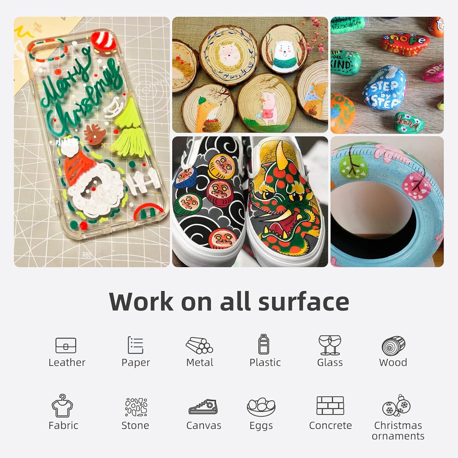 - 🌲【Multi-Purpose】These paint pens works on almost any surfaces, such as metal,glass,plastic,canvas,stone, paper, ceramic, rock, fabric,mug,wood etc. Perfect for DIY projects, card marking, journals, planners, coloring books,scrapbooks etc.