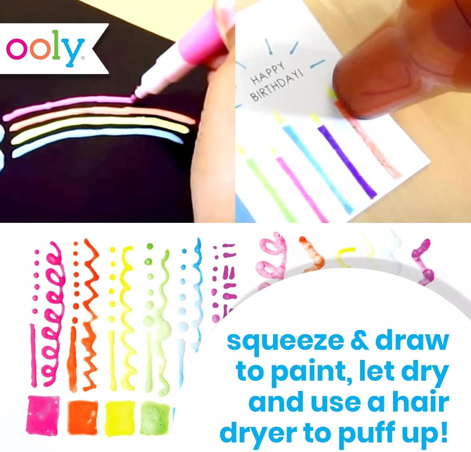 Ooly Puffy Paint Neon Gel Pens Set of 6, 3D Foam Texture Painting Magic Puffy Pen, Creative and Fun Pens for Kids Arts and Crafts Drawing Supplies
