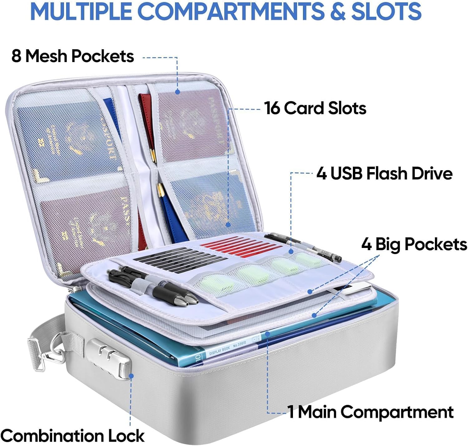 - Fireproof and Waterproof: The fireproof document box /bag is made of dust-proof silicone fiberglass, offering fire resistance up to 2192β, SGS-certified (UL94 VTM-0); Its waterproof design protects your documents from rain and spills (No folders included)