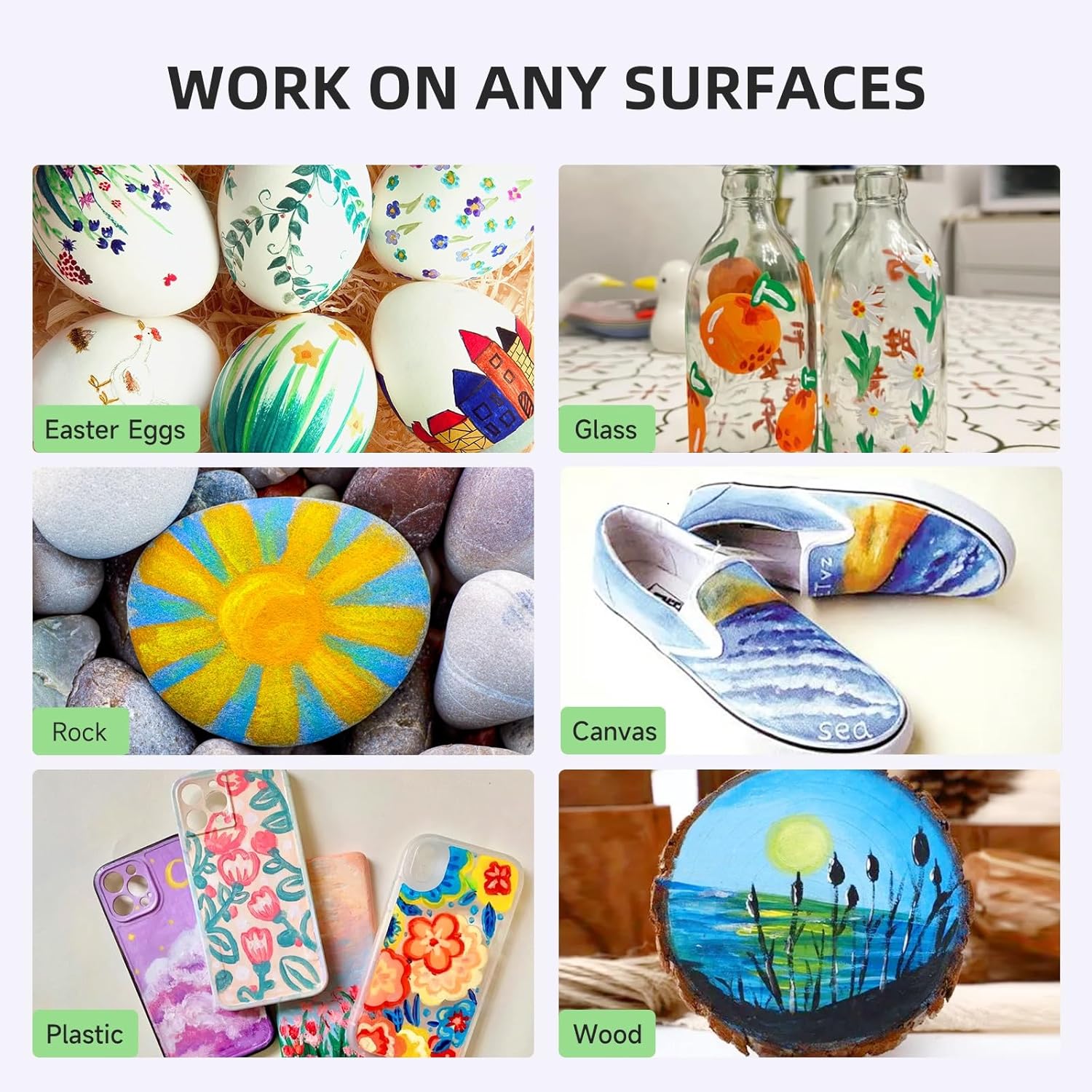 - 🎨【Multi-Purpose & Application】These acrylic paint pens are suitable for almost surfaces, such as metal,glass,plastic,canvas,stone,paper,ceramic,rock,fabric,mug,wood etc.