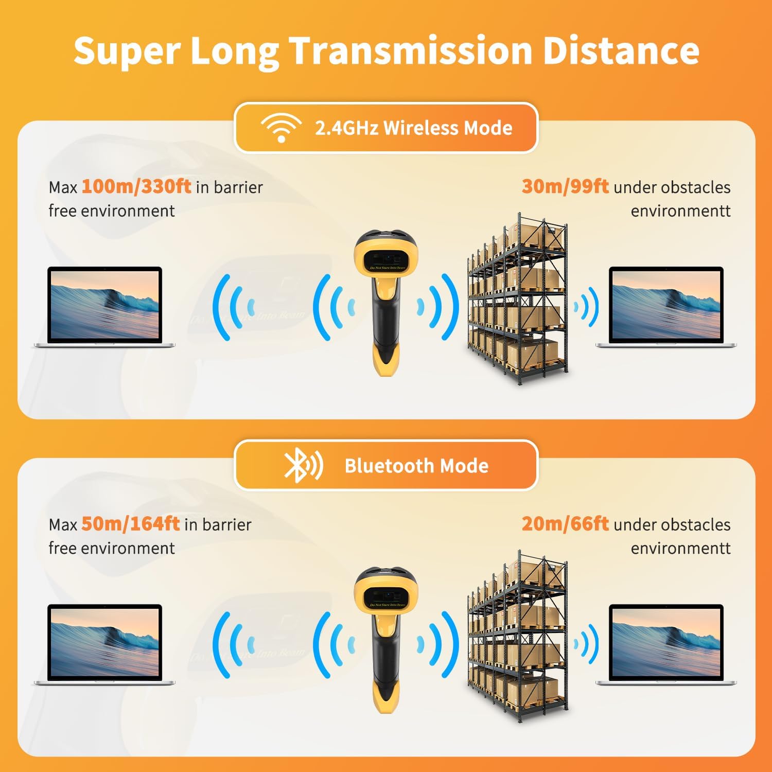 - ➤Auto Scanning & Storage Mode - Manual Scan & Auto-sensing Scan & Continuous Scan. Two working mode: Instant upload mode / storage mode. Scan and store barcodes, then update the data to your device when you come back entering the wireless transmission range. Sometimes the self-sensing scanning function is in the inactive stage, please contact us and be at your service at any time.