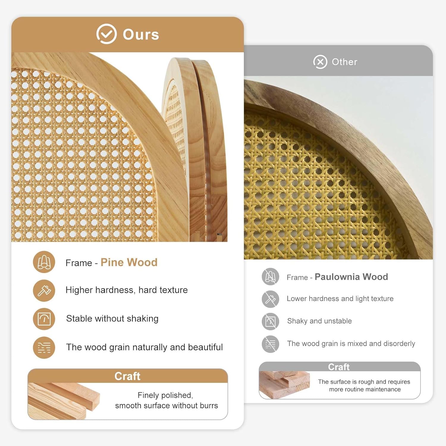 - High-Quality Material: The frame is crafted from PINE wood rather than the common paulownia wood found in the market. Pine is typically more durable, has a higher density, and is less likely to suffer damage and wear. Additionally, pine usually features a more appealing grain pattern, enhancing the aesthetic appeal. The minimalist style of pine wood and rattan, along with the perfect color combination, brings more warmth and naturalness to your room