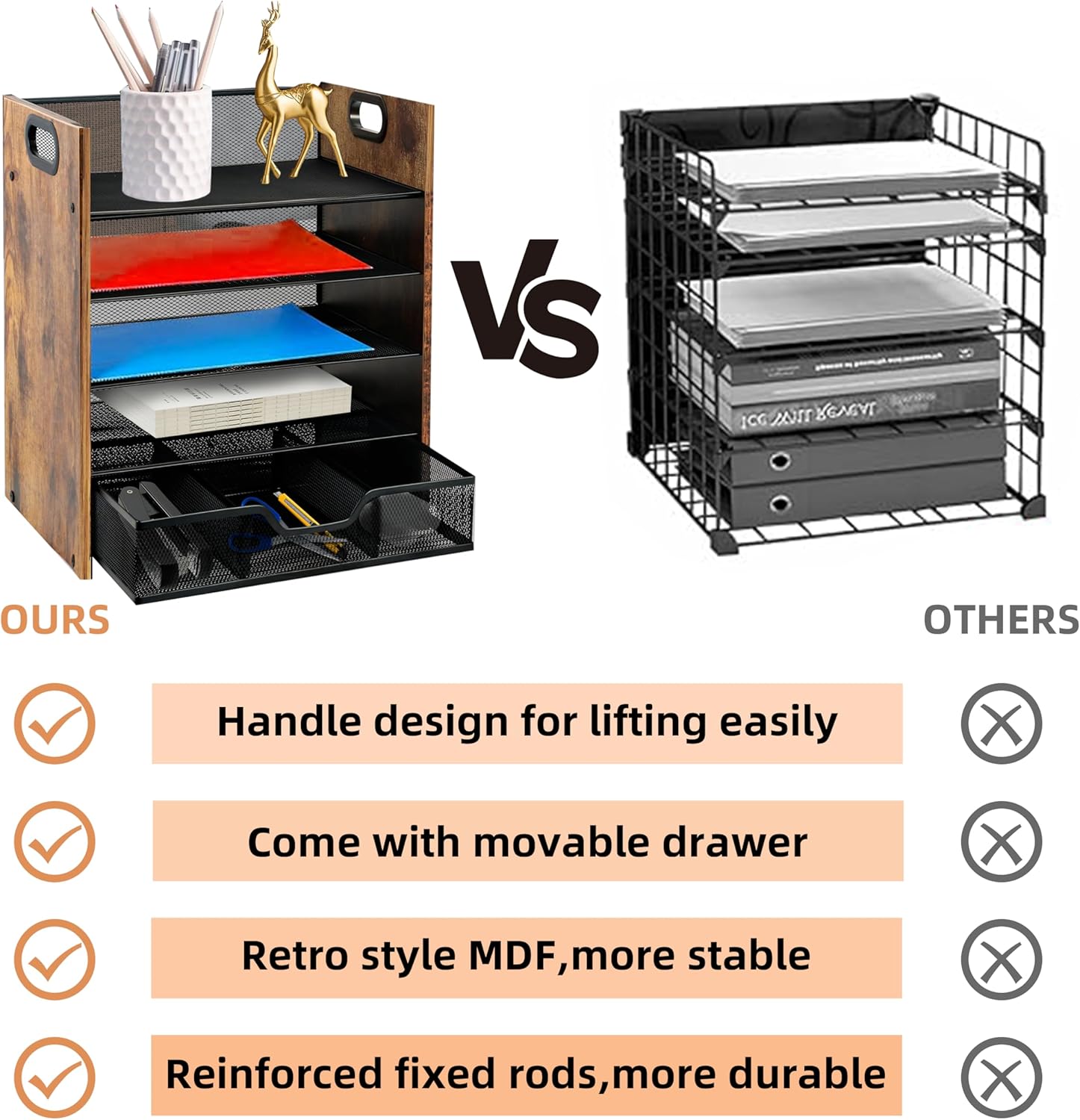 - 【Wooden Desk Organizer】 Made of iron frame and engineer wood boards, ensuring long-lasting durability. Enjoy a clutter-free and efficient workspace with our paper organizer storage. The different compartments and trays provide ample space for different categories, allowing for easy access to your important documents.