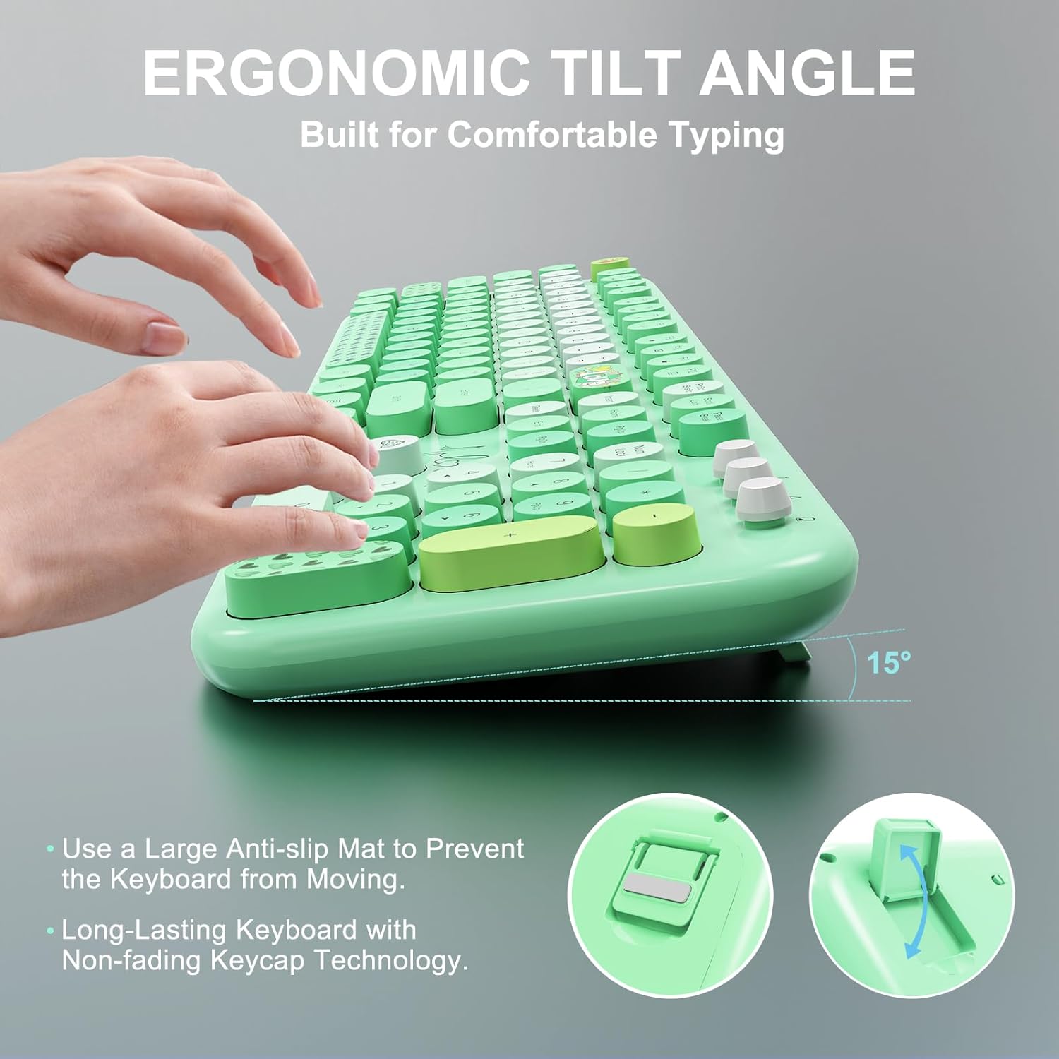 - ⊙ Fashion & Quiet Mouse Design Desk Accessories Keyboard - Stylish retro keyboard and mouse wireless with colorful round 104keys and glossy smooth edges to brighten your workspace. Featuring low-profile whisper-quet technology, this sleek combo ensures a distraction-free typing experience. Perfect for modern desks seeking cute wireless keyboard and mouse aesthetics.
