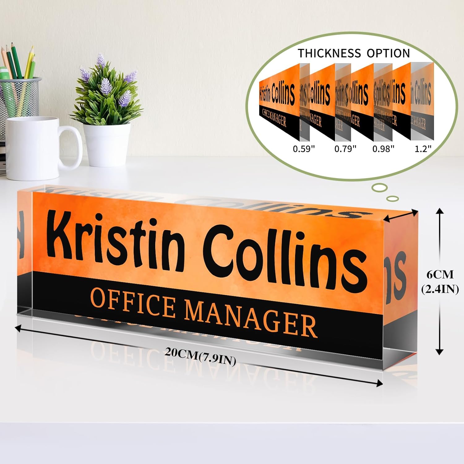 - π Premium Quality: Crafted from premium acrylic, the personalized desk nameplates are built to last. With exceptional durability and clarity, they're ten times stronger than glass. And thanks to the special UV printing technique, the colors stay vibrant and the text stays sharp, no matter how much time goes by.