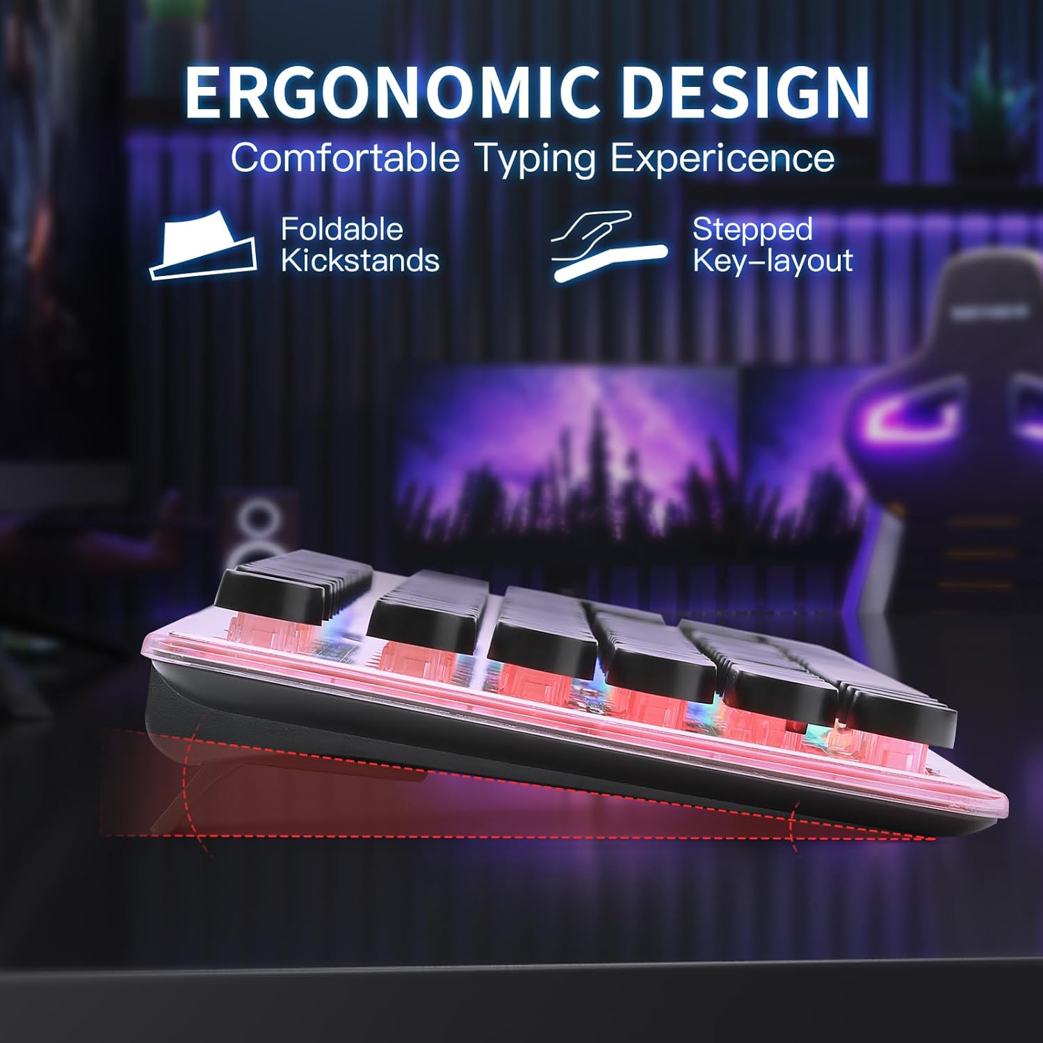 - β€ 104 Keys Ergonomic Keyboard β€ Ergonomic design with 2 angle feet on the back of the keyboard, smooth lines, comfortable feeling, and anti-fatigue. 12 multimedia keys combinations, 19 keys non-conflict. 12 combinations of multimedia keys facilitate the operation of your work or game and improve efficiency.