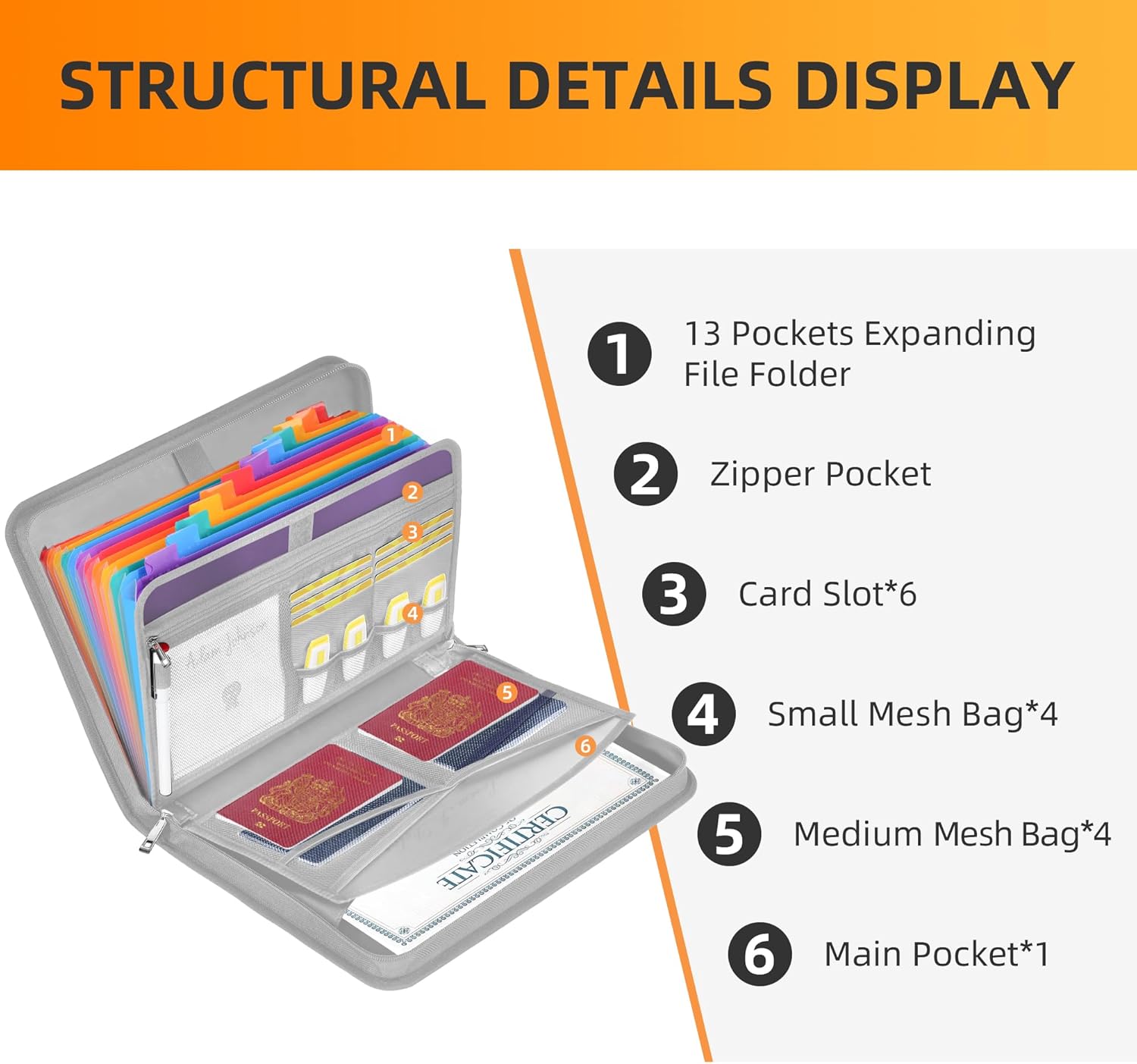 - EXPANSIVE CAPACITY: Discover the ease of JUNDUN's Accordion Document Organizer. Boasting 13 pockets, 1 zip pocket, 1 pen and 6 card slots, along with 4 small and 4 medium mesh bags β all thoughtfully fitted into a streamlined 13.97"x10.43"x1.96" frame. Securely house essential documents and belongings while effortlessly categorizing and swiftly accessing your files