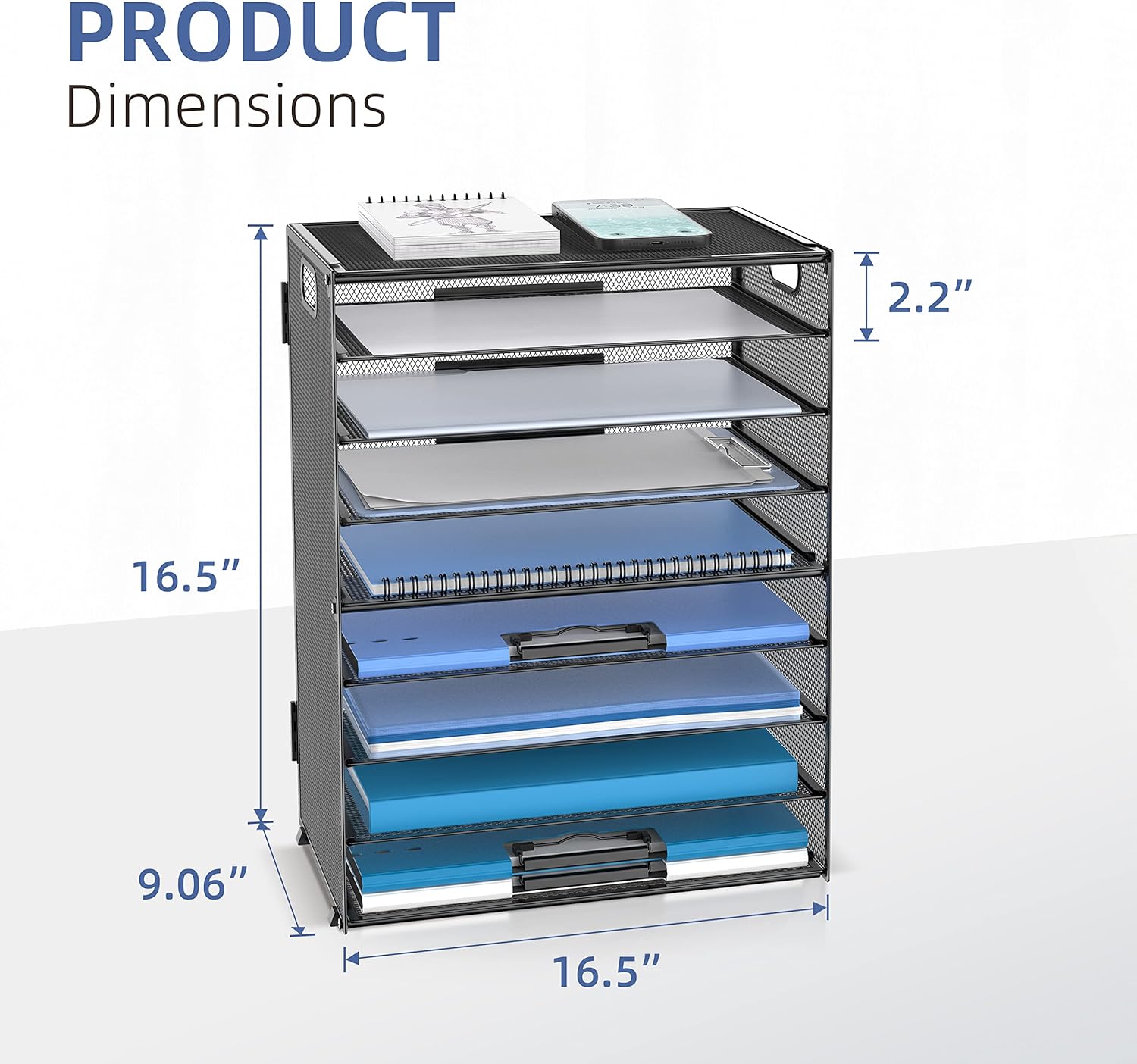 - [Perfect Paper Organizer] The 9-tier paper tray desk organizer has a large capacity for all your office supplies and accessories, such as: letters, paper, printing paper, books, folders, bills, magazines and so on. Keep your desk away from clutter and increase your productivity.