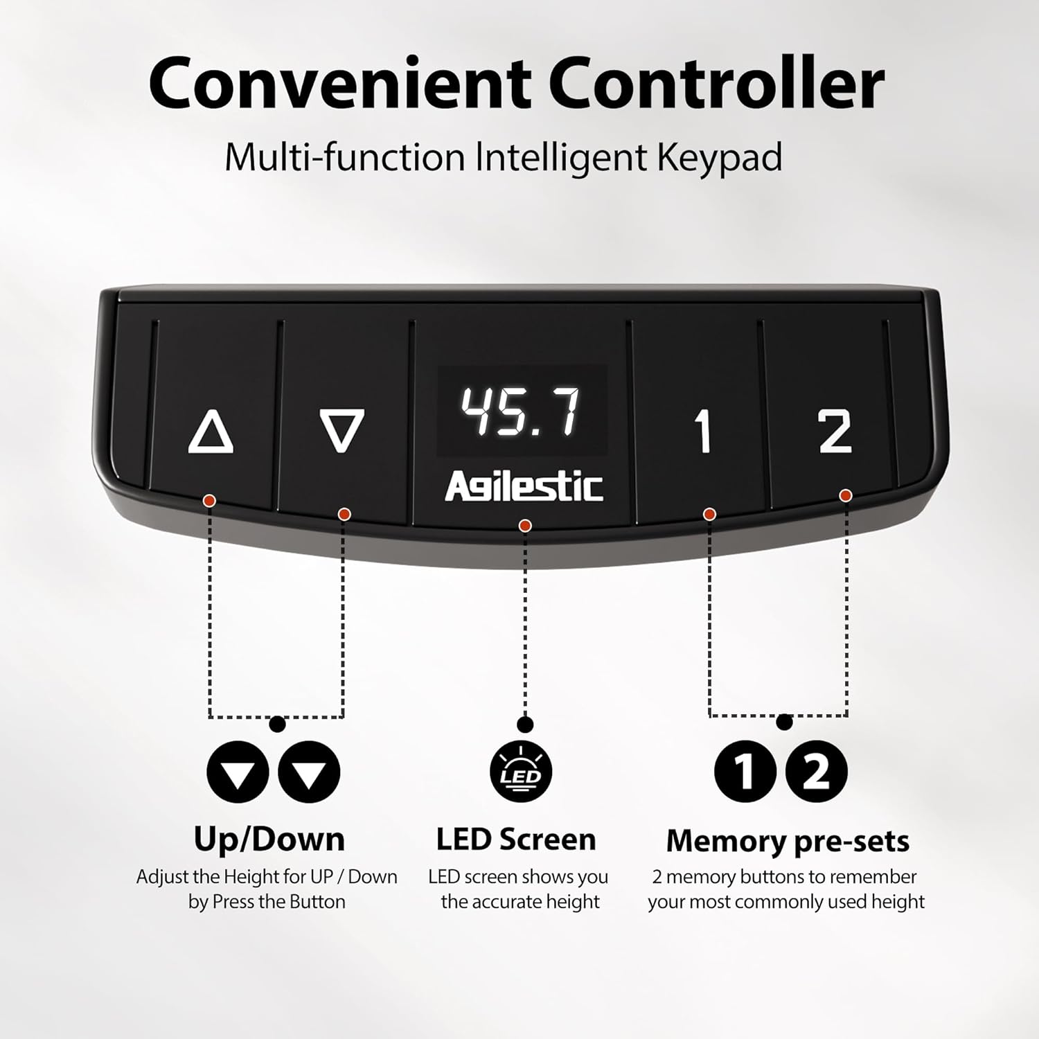 - 【Intellegent Lifting System】Agilestic standing desks are equipped with an advanced motor and support height adjustment between 28.3''-45.7'' with low noise(under 55 dB) while running. You can customize the desired height and record it using 5 memory keys.