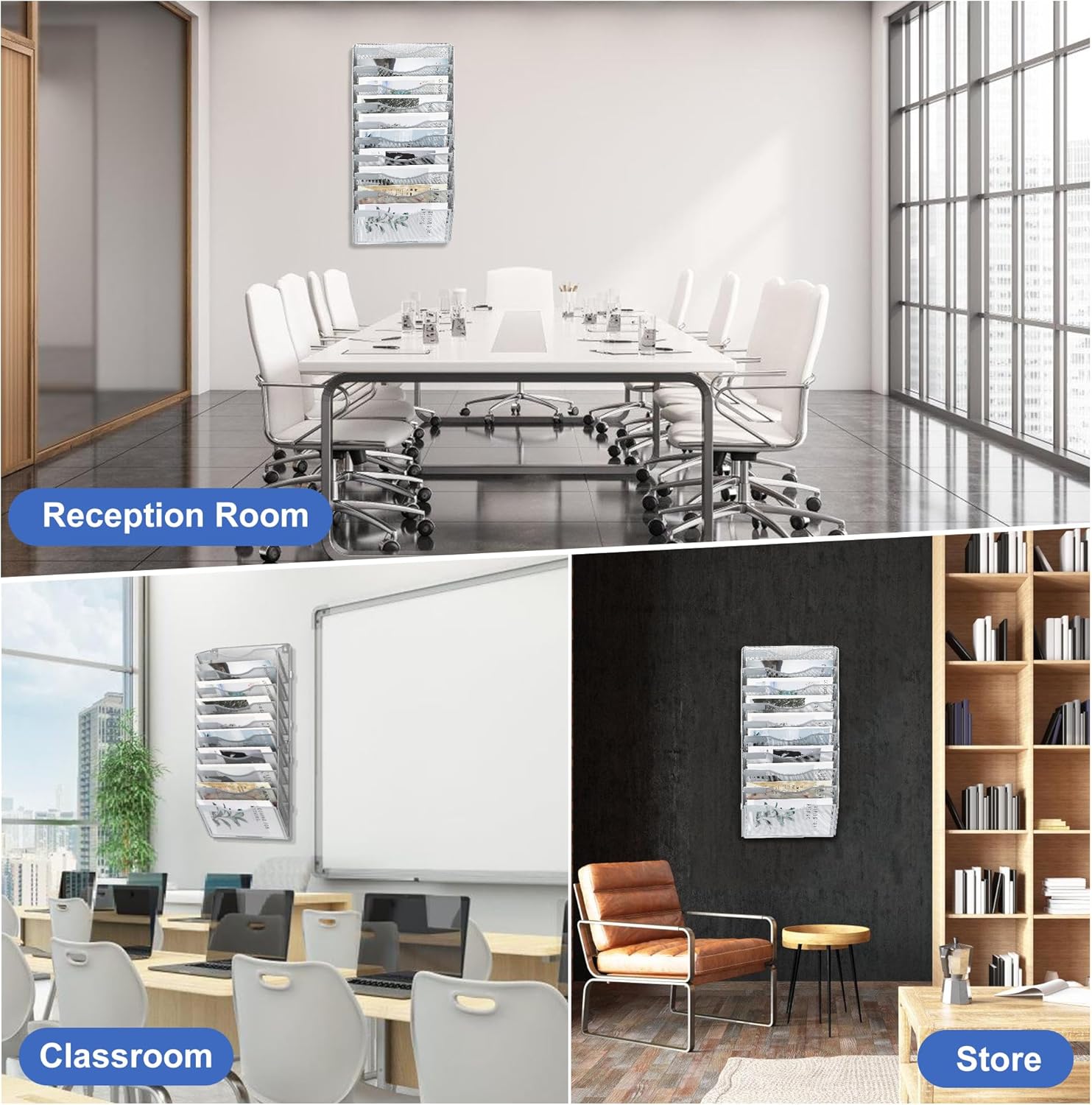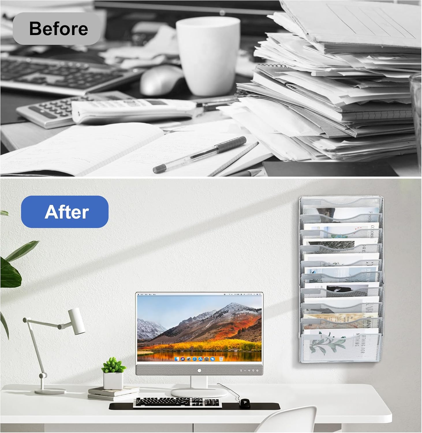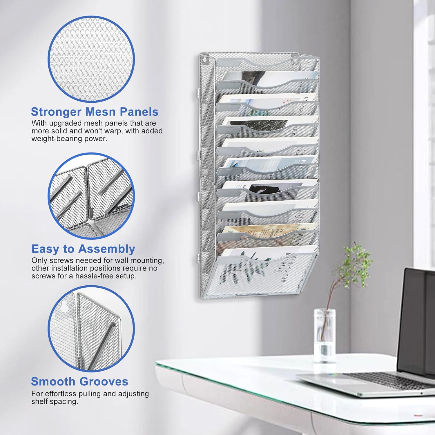 - Space Saving: 10 tier metal wall file organizer comes with mounting screws that can be easily mounted on the wall. Use your home or office space more efficiently by keeping your files organized and off the desk and workspace.
