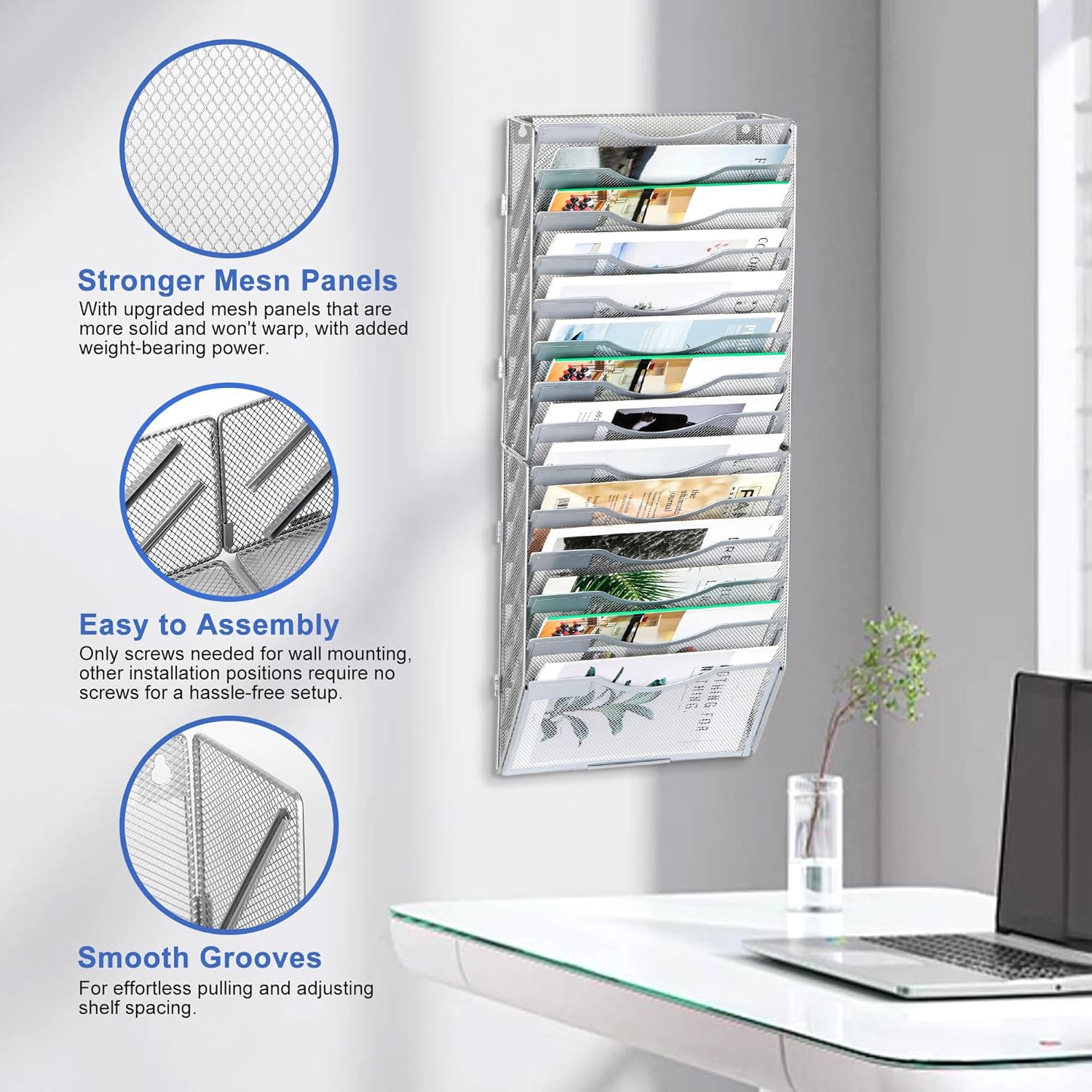- Space Saving: 14 tier metal wall file organizer comes with mounting screws that can be easily mounted on the wall. Use your home or office space more efficiently by keeping your files organized and off the desk and workspace.