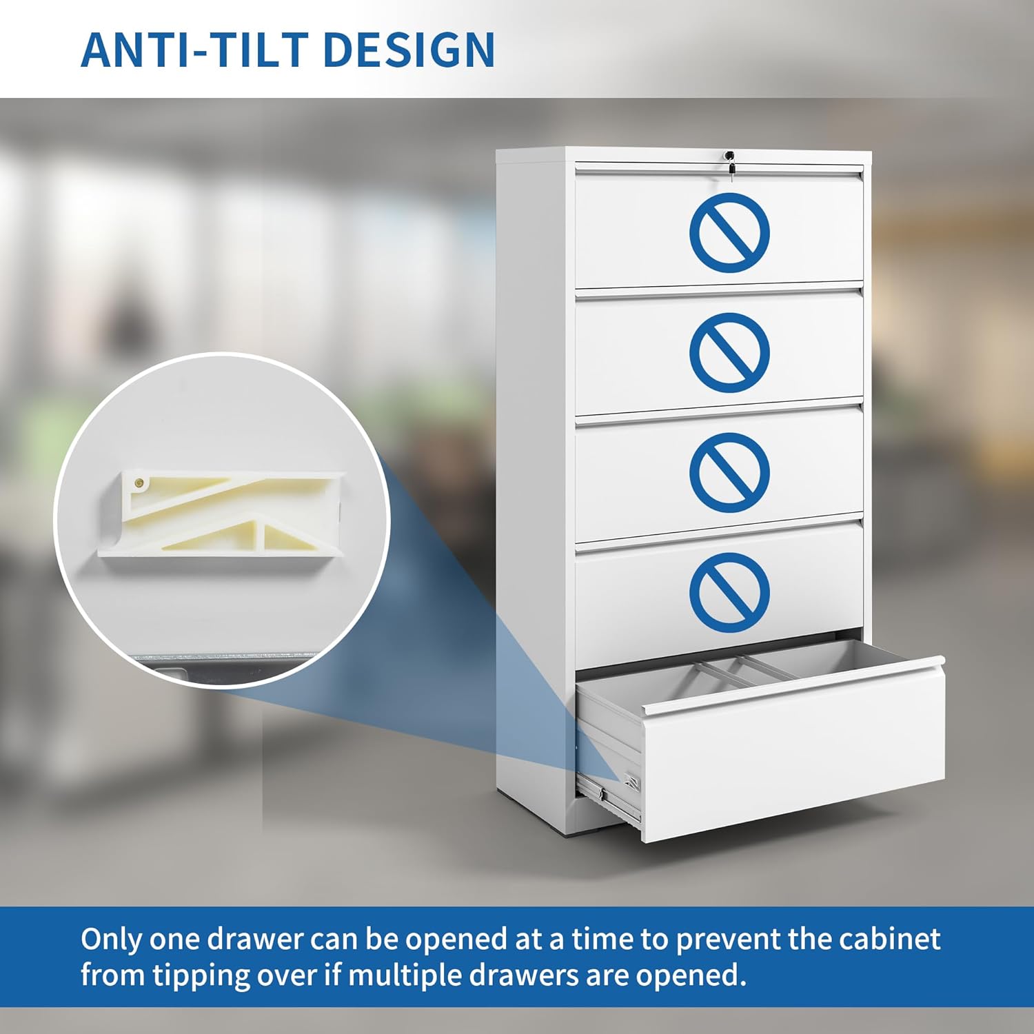 - 【Anti-tilt System】: This 5 drawer lateral file cabinet with lock meet your needs. It has has a anti-tilt design, ensuring that only one drawer can be open at a time. By preventing multiple drawers from being open simultaneously, the office cabinet maintains stability and greatly reduces the risk of tipping. You can have peace of mind knowing that your documents and equipment are secure.