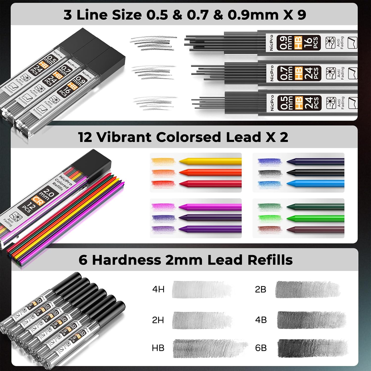 - Mechanical Pencil Drawing Set β Come with 6pcs full metal mechanical pencils and 2 pcs 2mm lead holder, 20 tubes of lead refill including 9 tube of HB lead refills in 0.5mm & 0.7mm & 0.9mm , 9 tube of 2mm (4H 2H HB 2B 4B 6B) graphite lead refills and 2 tube of colors lead refills, 3 pcs 4B erasers, 1 pcs kneaded eraser, 18 pcs cap eraser refills, 2 pcs lead sharpeners,all in a protective storage case.