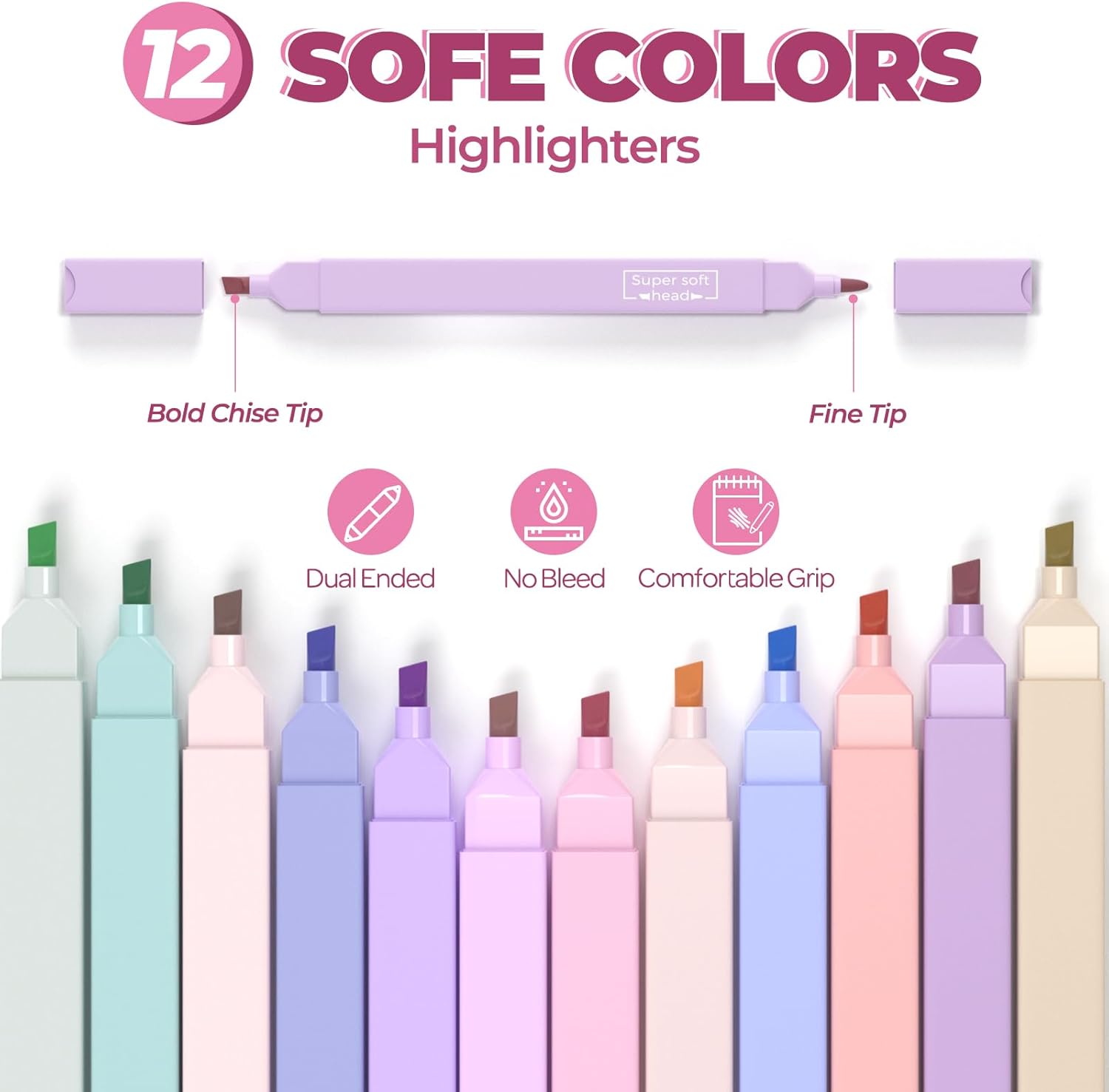- 12 Colors Dual Ended Highlighters: Flat shape barrel with chisel and fine tip, comfortable and easy to hold. Water based ink, dry quickly and no bleeding, the highlighter color is soft and gentle, great for broad highlighting or fine underlining,ideal for travel diary, schedule, work, study, notes
