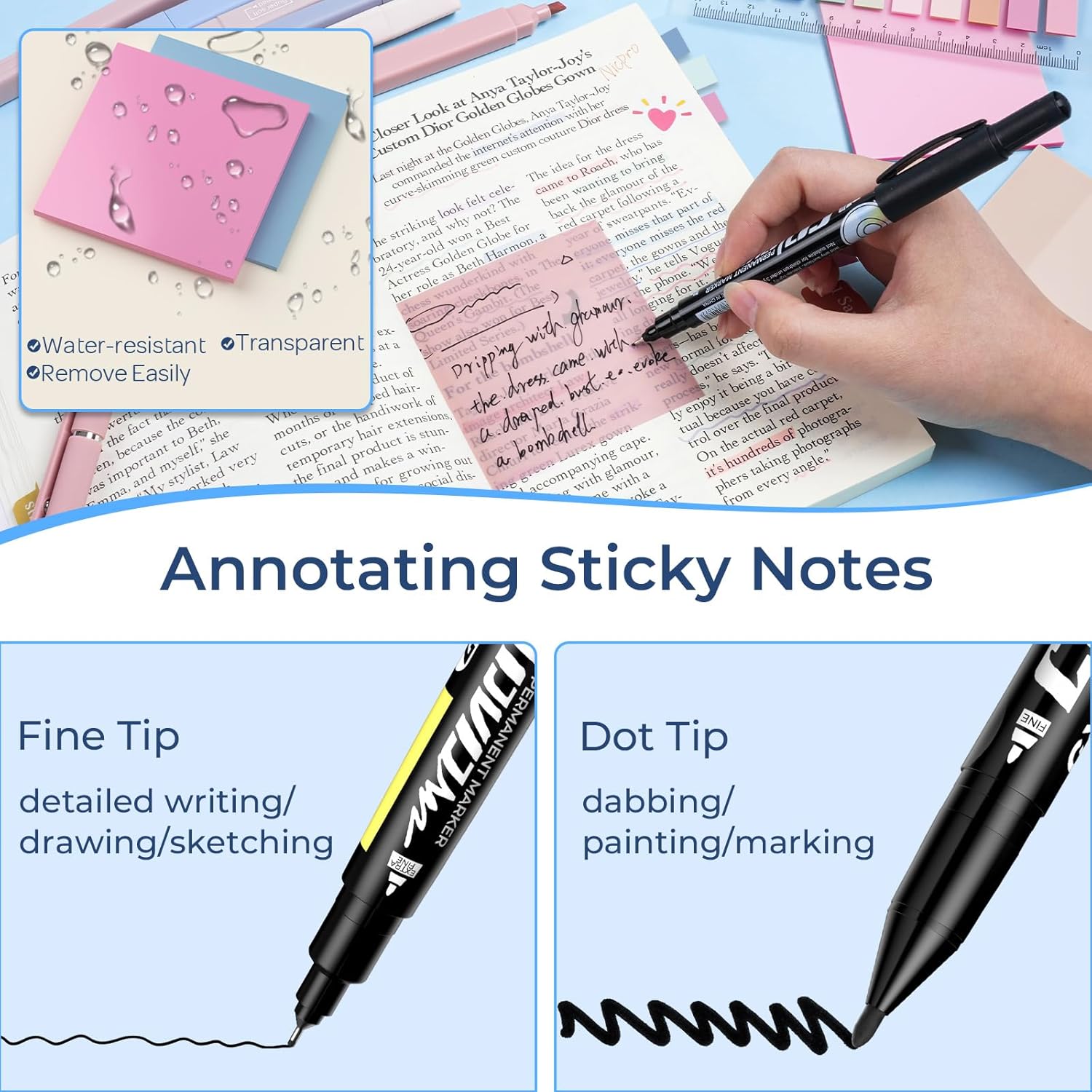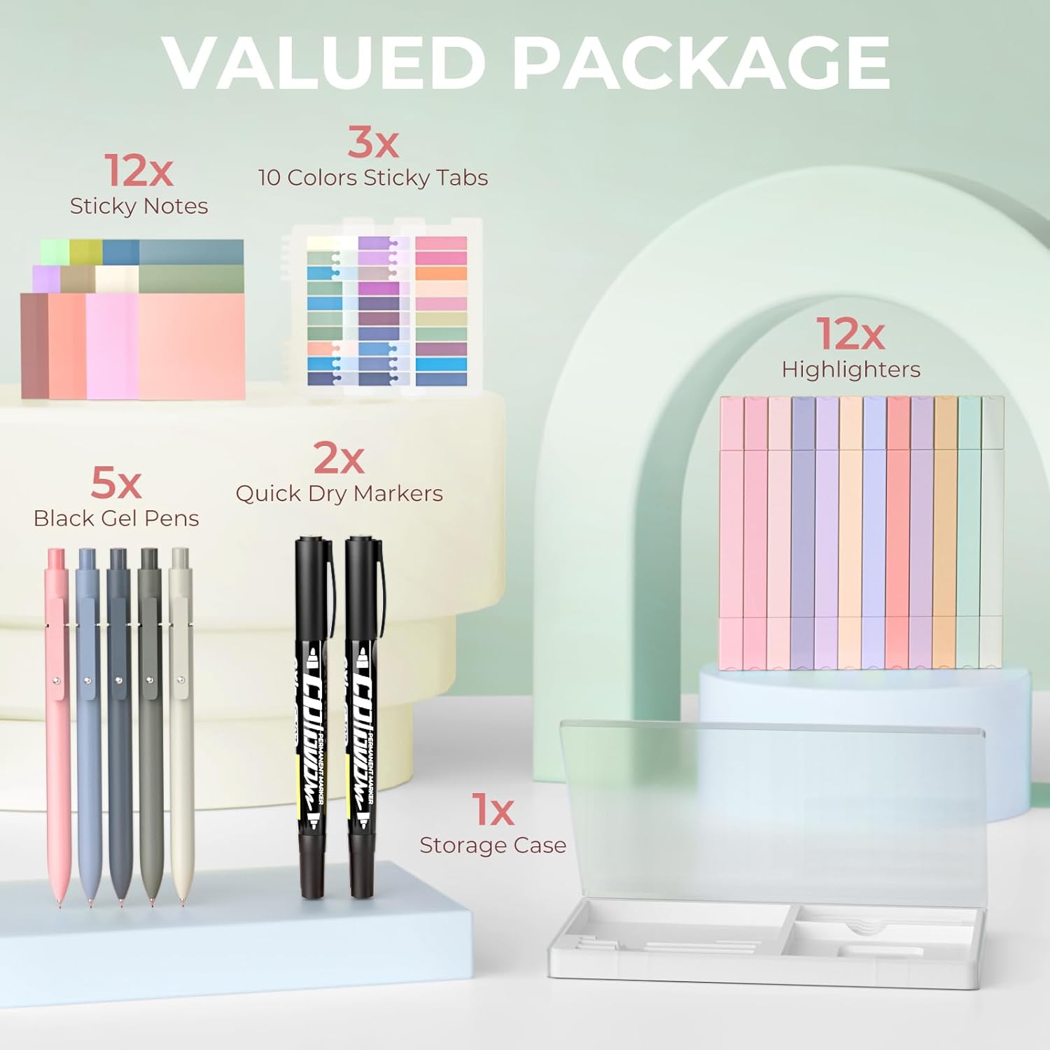 - Value Aesthetic School Supplies: Come with 12pcs dual ended pastel colors highlighters, 5 pcs black ink gel pen, 2 quick dry double head markers, 600pcs transparent sticky notes pads and 600pcs transparent sticky index tab. This is the ultimate combination of stationery essentials for office and school supplies