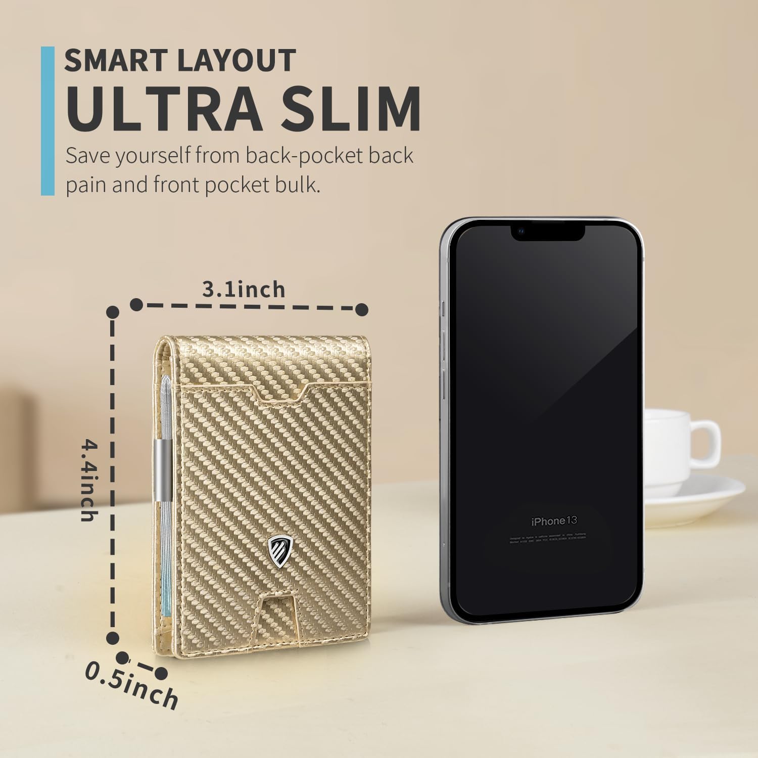 - Slim Wallet for Men - The Minimalist wallet being 1/2 inches thicks, sized 4.4" x 3.1" with money clip has 11 card slots which can store up to 15 cards. The thin wallet for men perfectly fits in your pocket and well-suited for everyday carry