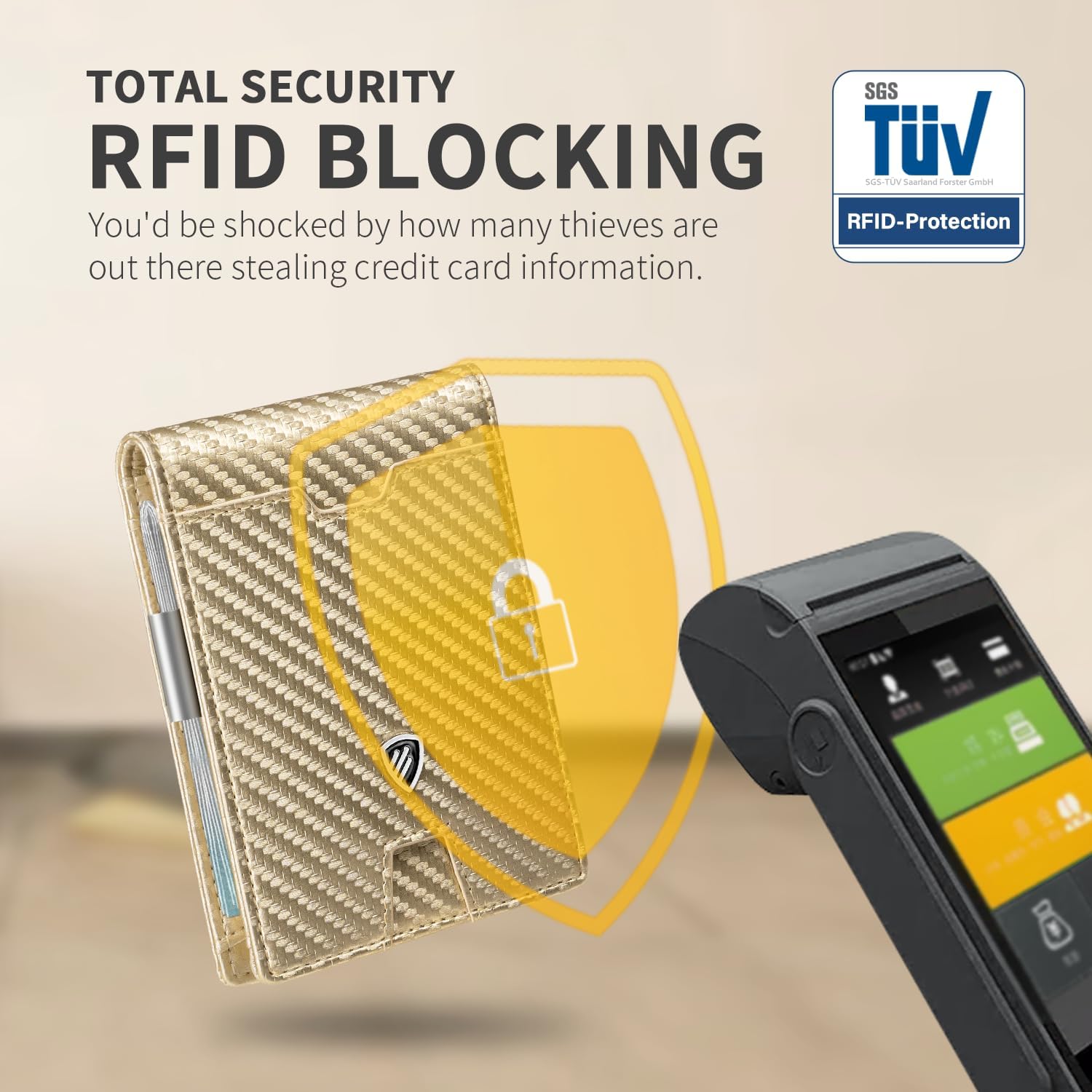 - RFID Blocking Protection - This rfid wallet for men is tested by an independent German quality control institute, specifically to block 13.56 MHz or higher RFID signals and protect against data theft by RFID scanners