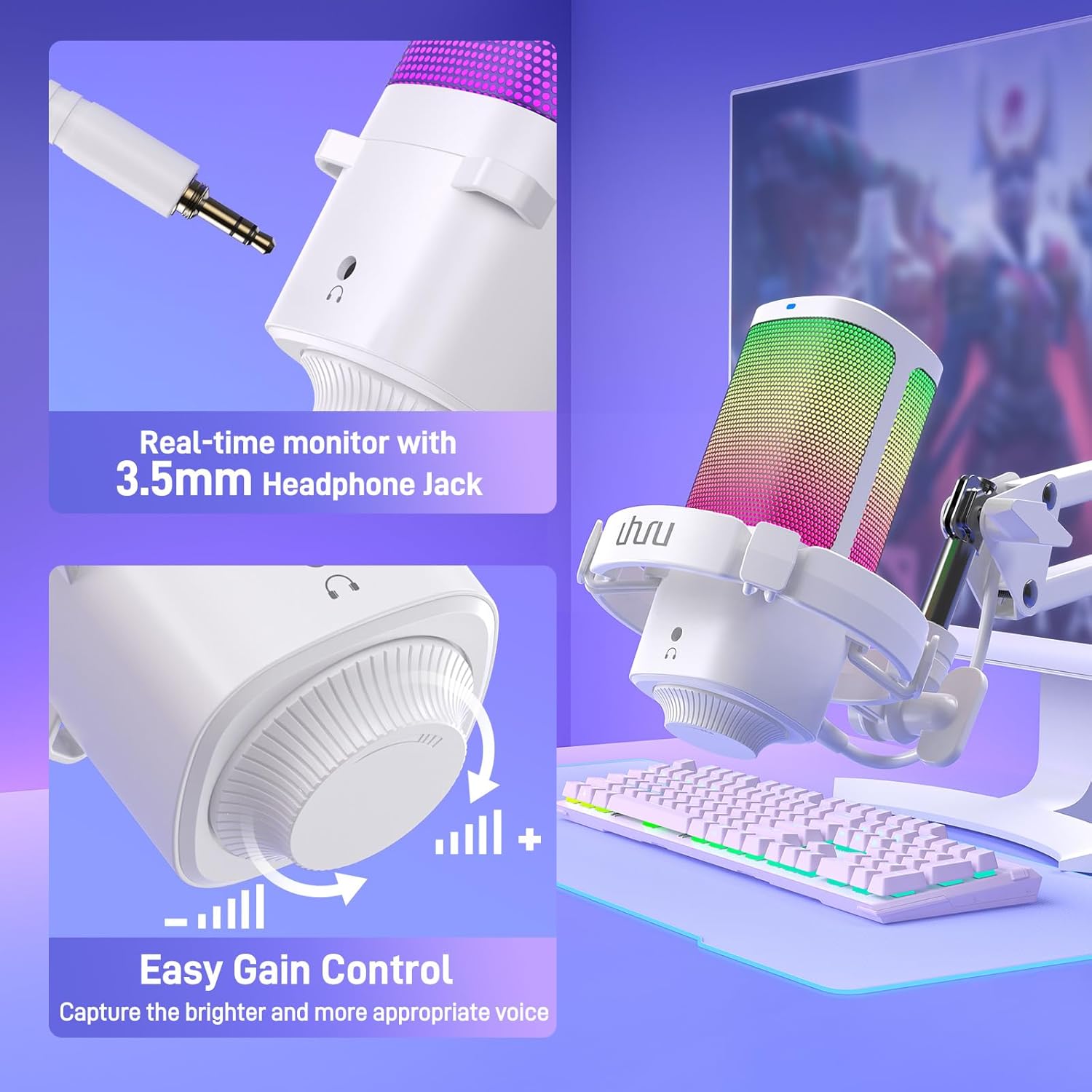 - More Function Keys: The USB gaming mic with a headphone jack lets you hear the voice of your teammate or audience in real time and you can make adjustments in time. Easily adjust your microphone's gain by turning the dial at the bottom of the PC microphone, ensuring that you maintain an appropriate volume at all times