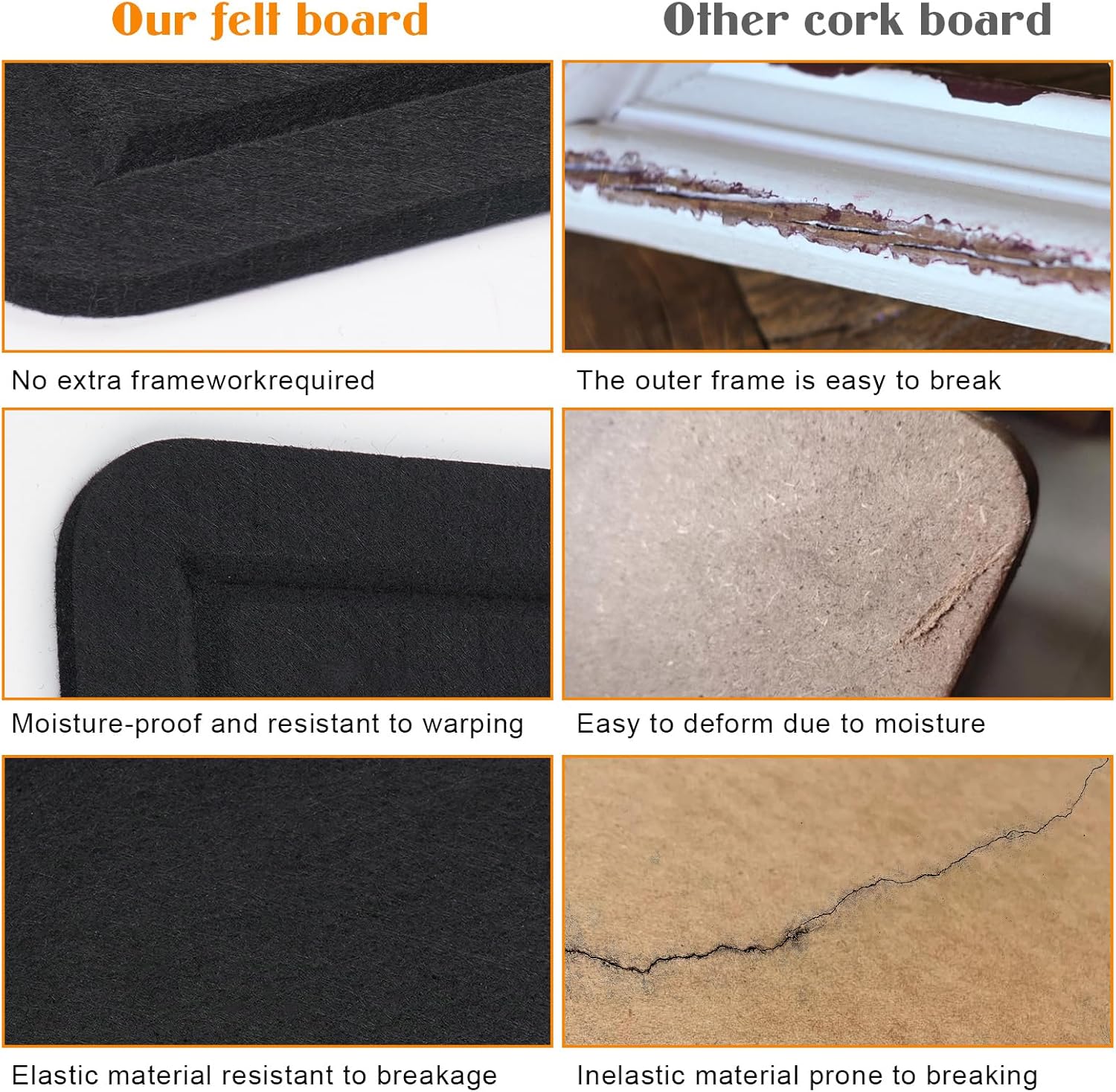 - Large Cork Board Alternative: Our large felt board boasts smooth surface. The material is strong, easy to maintain, durable, and won't deform in humid air. No nails are required to install, and the included Velcro are removable and safe for your walls. A good choice for home offices, classrooms, and commercial places.