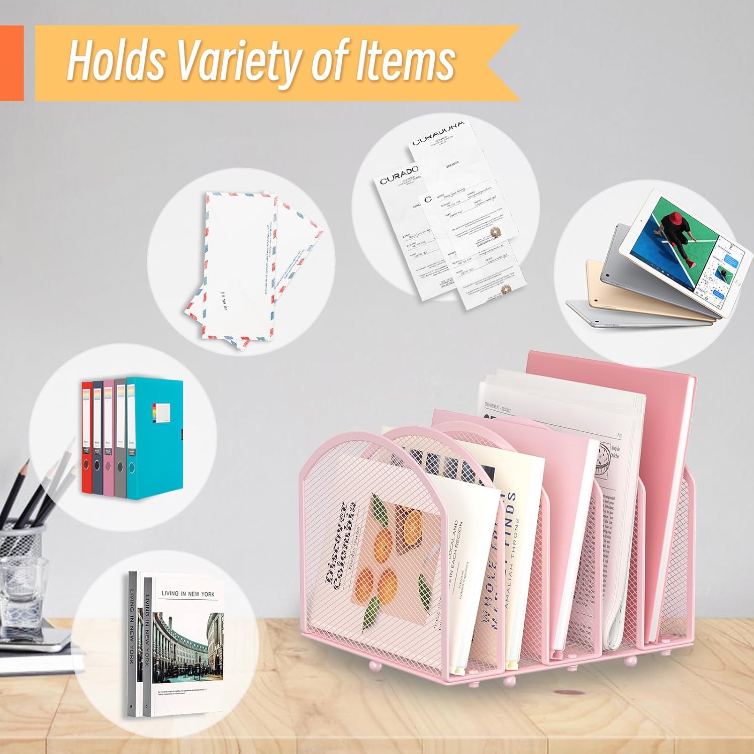 Desk File Organizer 5 Sections Desktop Organizer File Sorter Office Organization File Folder Holder for Office School & Classroom (Pink, 5 Section - 1Pack)
