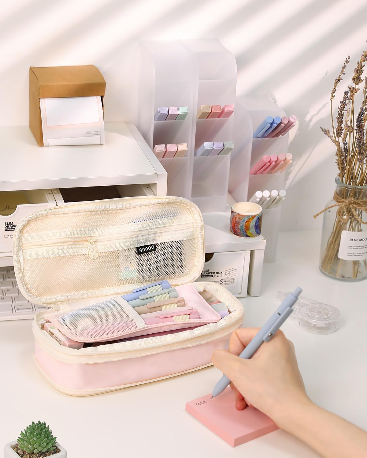 SKYDUE Cute School Supplies 44 PCS, Aesthetic Pencil Case with 12 Pastel Highlighters, 5 Black Gel Pens, 6 Color Gel Pens & Mechanical Pencils, College Essentials Students Stationary Set Pink