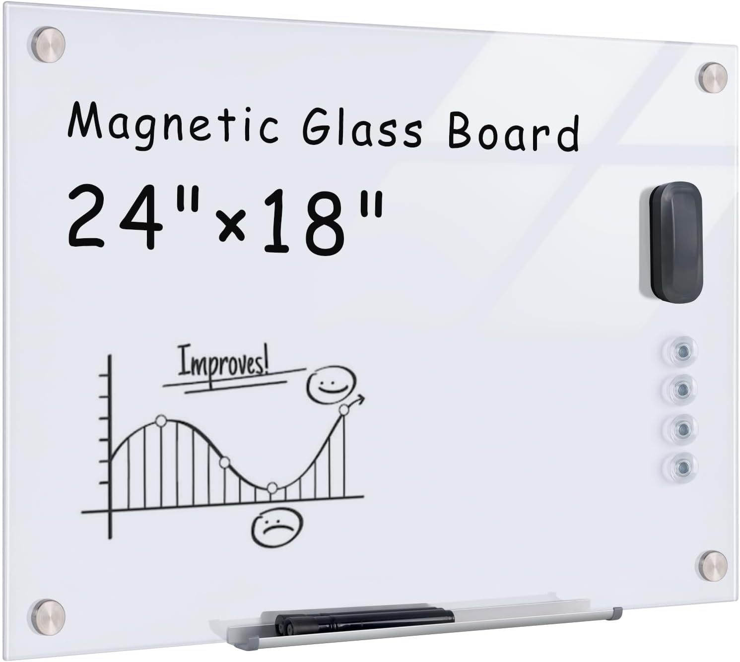 Magnetic Glass Whiteboard,24"x18" Wall Mounted Frameless Dry Erase Board for Office, Home & School Ultra White