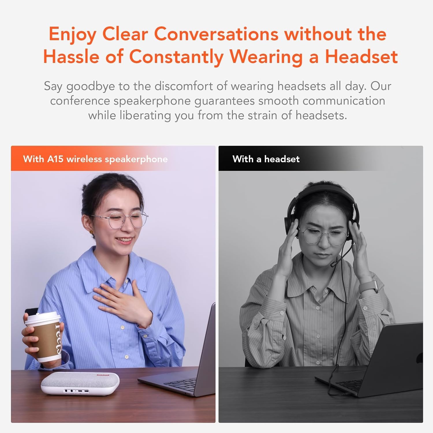 - 360° voice Pickup & Multi-Microphone Array: A15 Bluetooth speakerphone is equipped with upgraded full-duplex digital microphone and 4 MEMS Mics which can pickup voice within 3 meters radius and suitable for 6-10 people conference meetings.