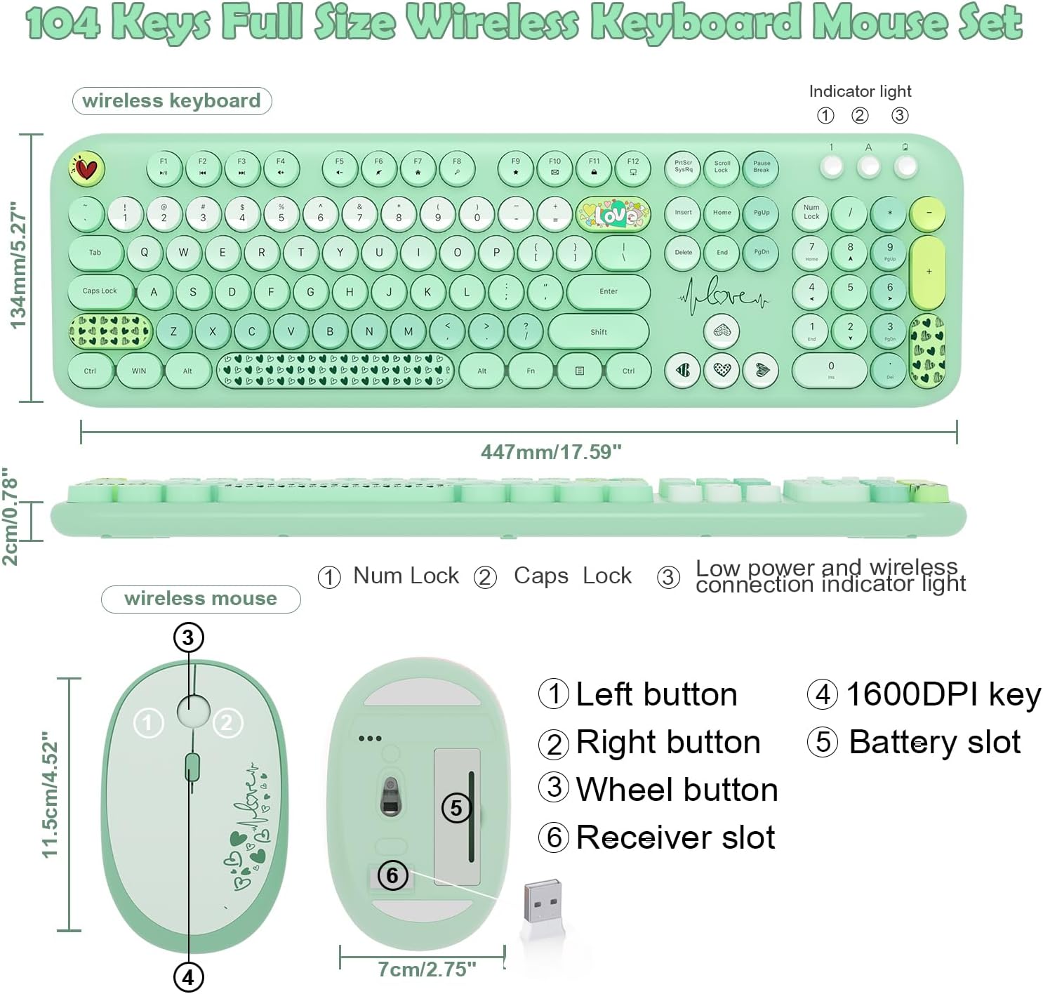 - 2.4G wireless connection,No Lag: Enjoy a seamless wireless experience with the USB receiver; 2-in-1 nano receiver, no need to install other software, this wireless keyboard and mouse set features an endearing lovely theme with cute icons and a soft color scheme. The keys on the top are in a love pattern, which adds a romantic color and a new element to work, and a good mood for every day's work and life