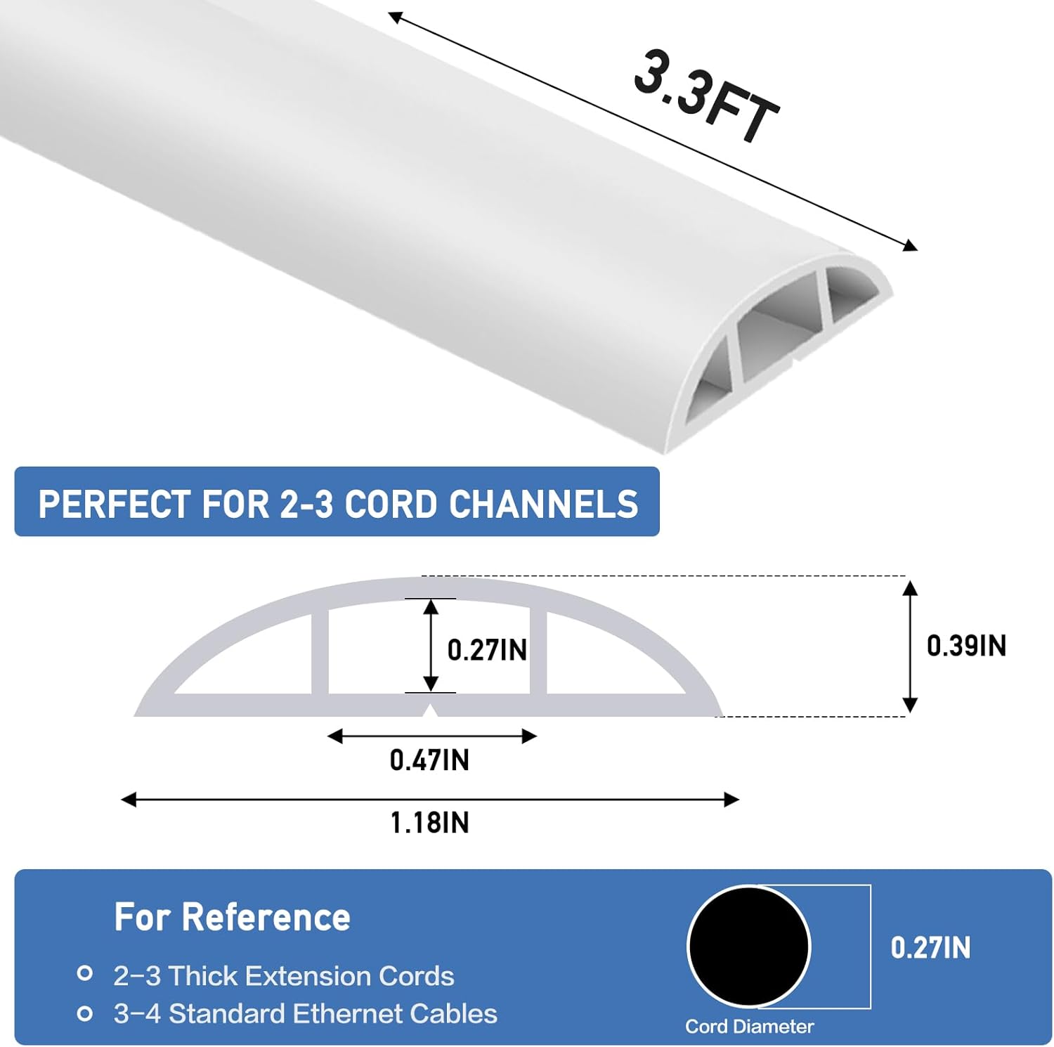 Floor Cord Cover Self Adhesive Cord Hider Floor Extension Cord Covers for Floor Power Cord Protector Cable Management Prevent Cable Trips Cable Cavity 0.47" W x 0.27" H (White, 3.3Ft)