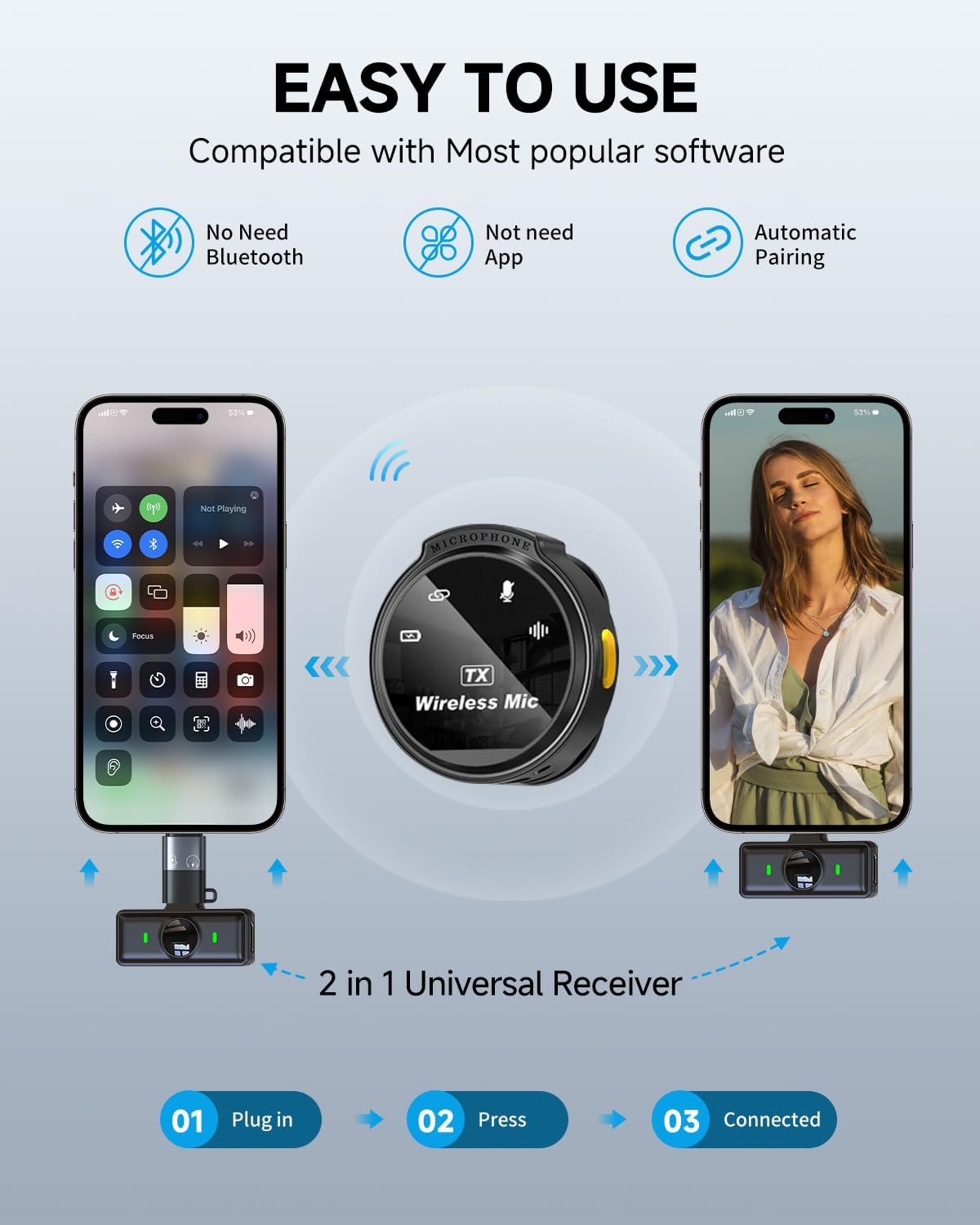 - Plug and Play: No Bluetooth or APP needed. The wireless lavalier microphone can be clipped to the collar for hands-free audio and video recording. Just need to plug the receiver into your device, and power on the microphone, it will start working for you soon