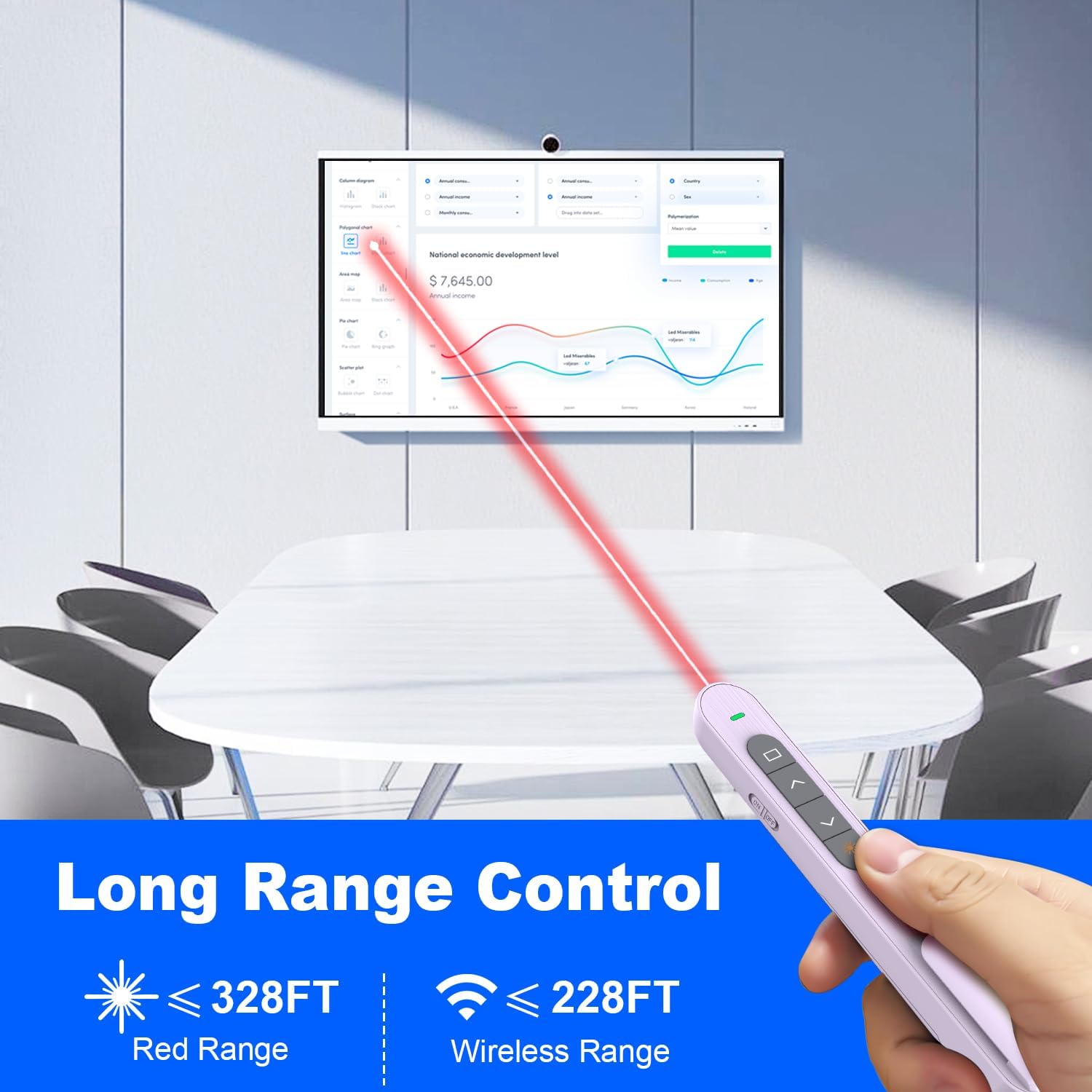 - ă100M STABLE CONNECTION CONTROLăThis wireless presenter remote has a coverage range of up to 328 feet, you can walk out from behind the podium and move around the room, actively talk with the audience, make your lectures more interactive, and enjoy a stable presentation process