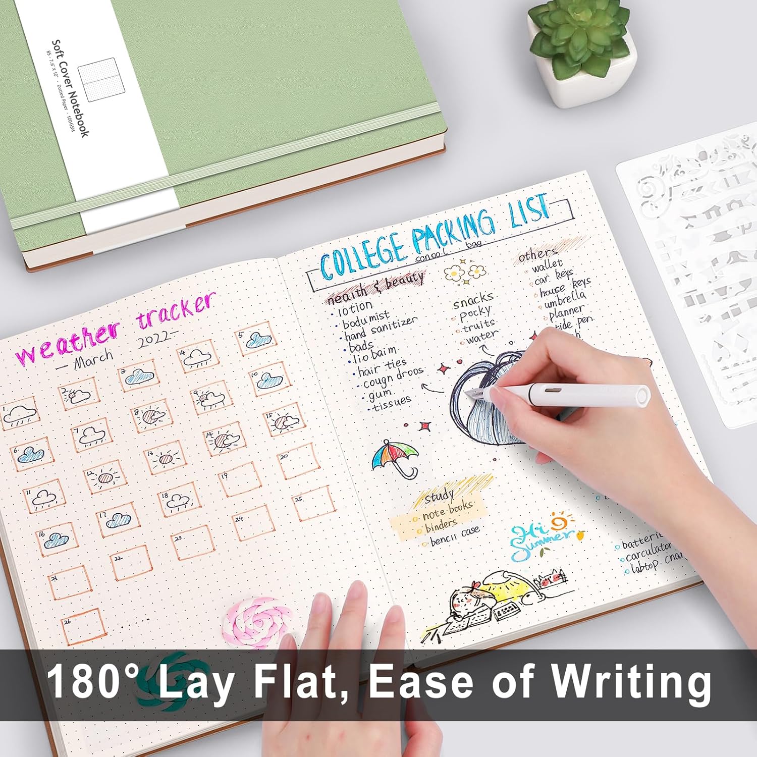 AHGXG Bullet Dotted Journal - 320 Pages Dot Grid Notebook B5 Large Journal, 100gsm Thick Dotted Paper, Leather Softcover, with Journal Stencils, Inner Pocket, 7.6'' X 10'' - LightGreen