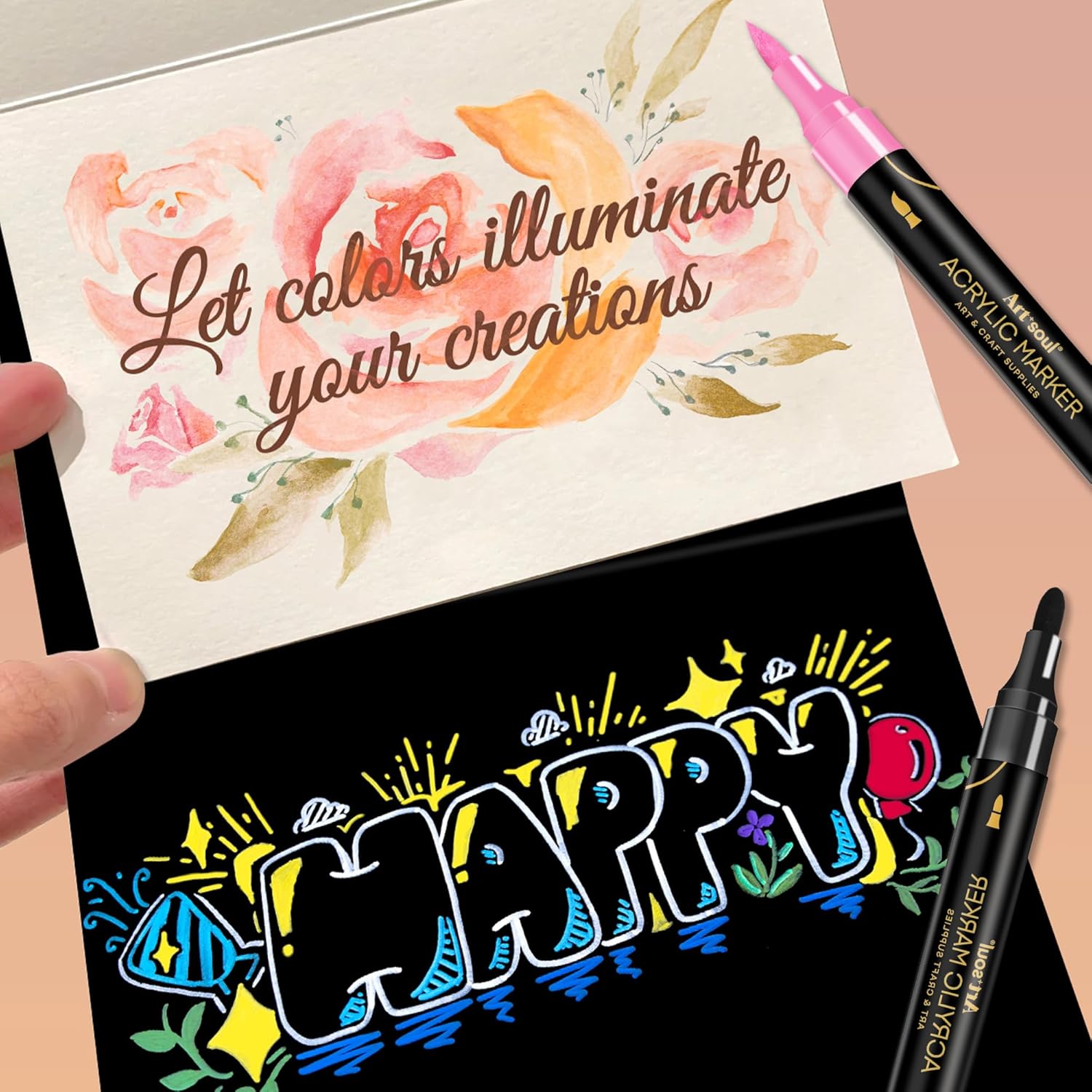 - Versatile Application: Art+soul 24 Colors Premium Acrylic Paint Pens can be used on a variety of materials including canvas, paper, glass, ceramics, wood, stone, Plastic, Metal and Textile ect. Whether you're decorating indoors or adding personalized designs to outdoor items, they allow you to effortlessly achieve a variety of artistic effects
