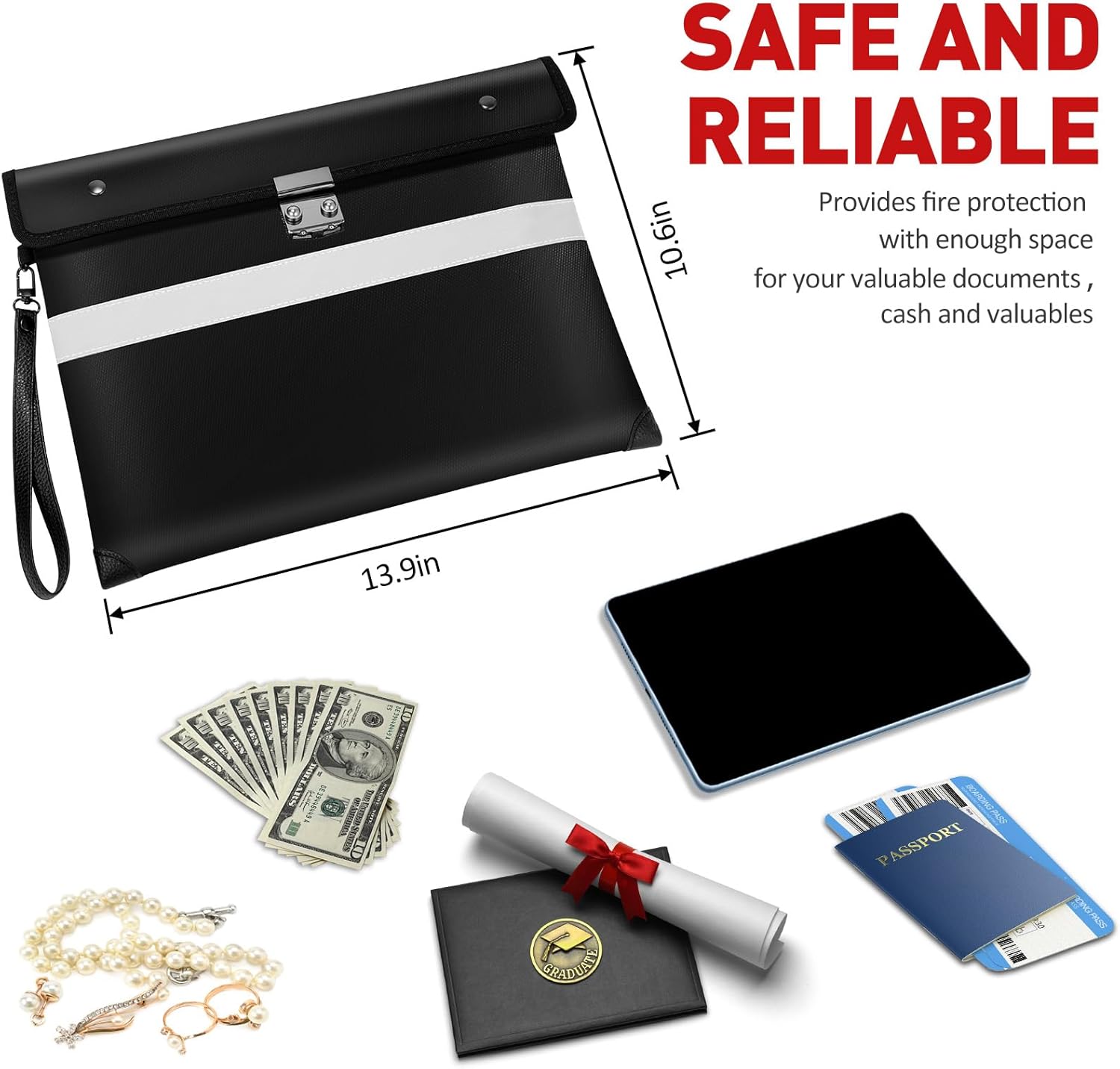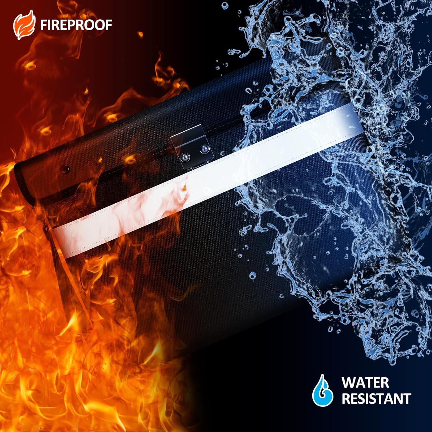 - 🗃️【Multiple Occasions】Fireproof lock bag are suitable for many occasions: offices,homes,lockers,safes,travel and others.A fireproof locking bag and safe combined is the best solution for complete protection of your important documents and valuables in the event of a fire.And the front of the fireproof bag is designed with slender reflective strips,making it easy to find the document bag even in the dark.