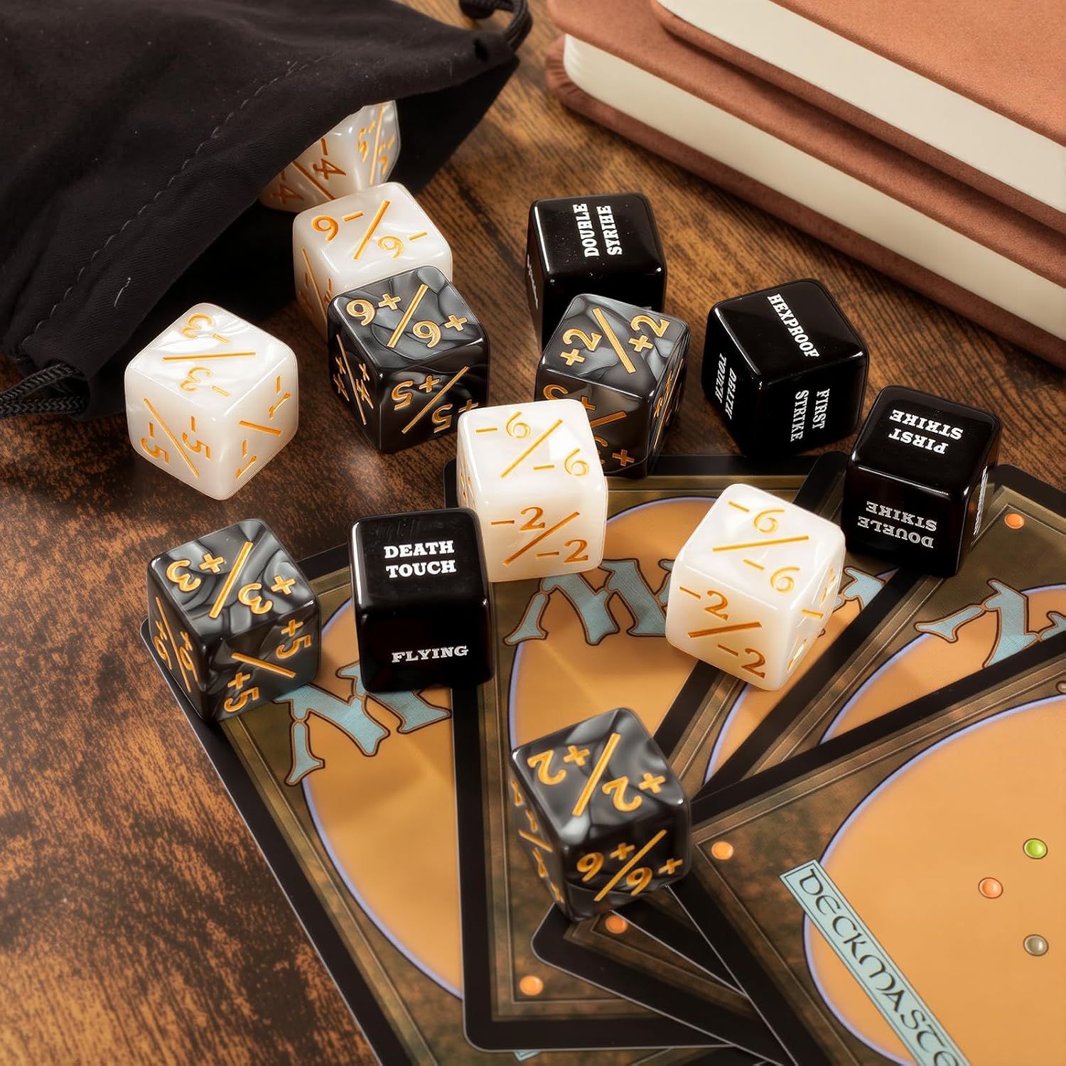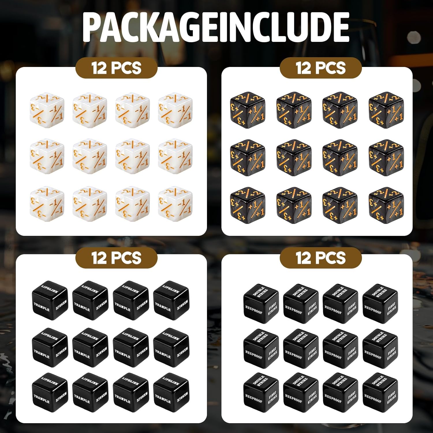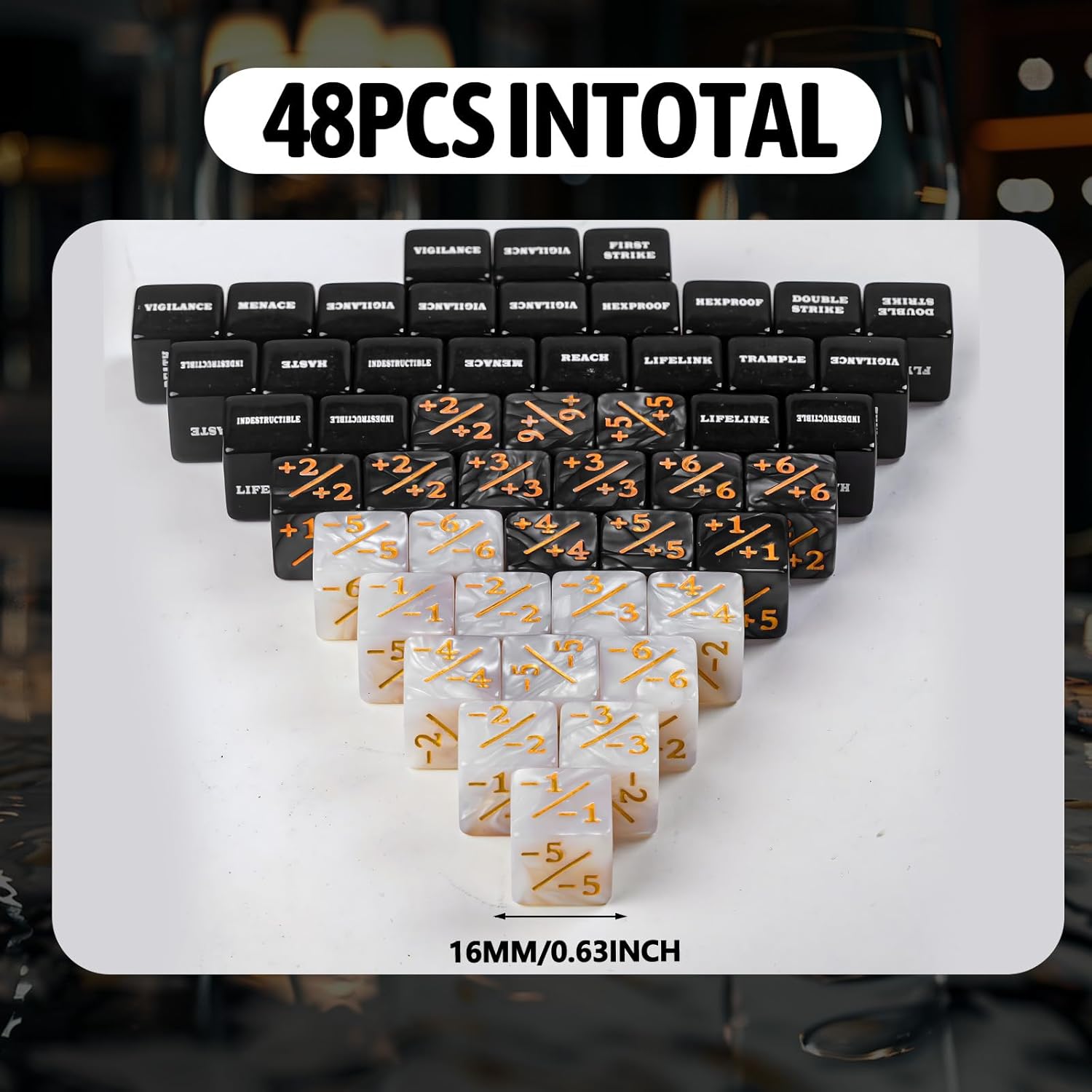 - What You Will Get: Total 48 pieces mtg counters with 2 flannel cloth bags. Includes 24 pieces keyword counter dice (HASTE, INDESTRUCTIBLE, LIFELINK, TRAMPLE, REACH, MENACE / DOUBLE STRIKE, FIRST STRIKE, DEATH TOUCH, FLYING, HEXPROOF, VIGILANCE) and 24 pieces counter dice ("-1~-6", 12pcs / "+1~+6 ", 12pcs)