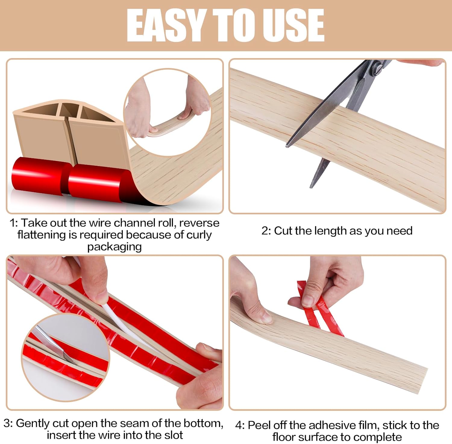- 【Easy to Install】Extension cord covers adopts self-adhesive design, users only need to tear the tape on the back to fix it on the floor easily. If you need a shorter length of floor cord hider, you can use scissors to cut it easily.