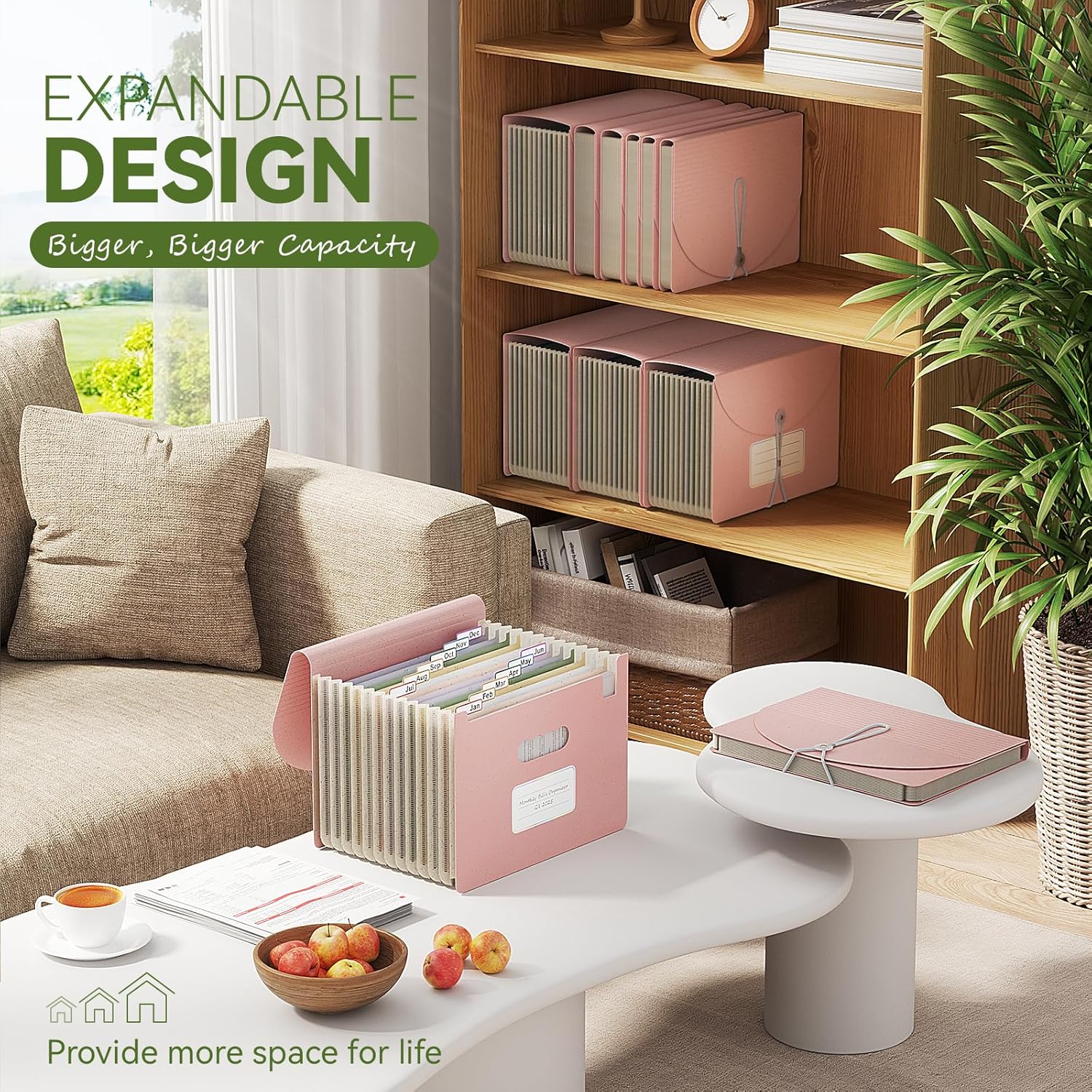 Accordion File Organizer, 13 Pockets Wheat Straw Expanding File Folder, Portable Monthly Paper Bill Tax Receipt Organizer, Letter A4 Size Document Holder with Colorful Tab - Strawberry Pink