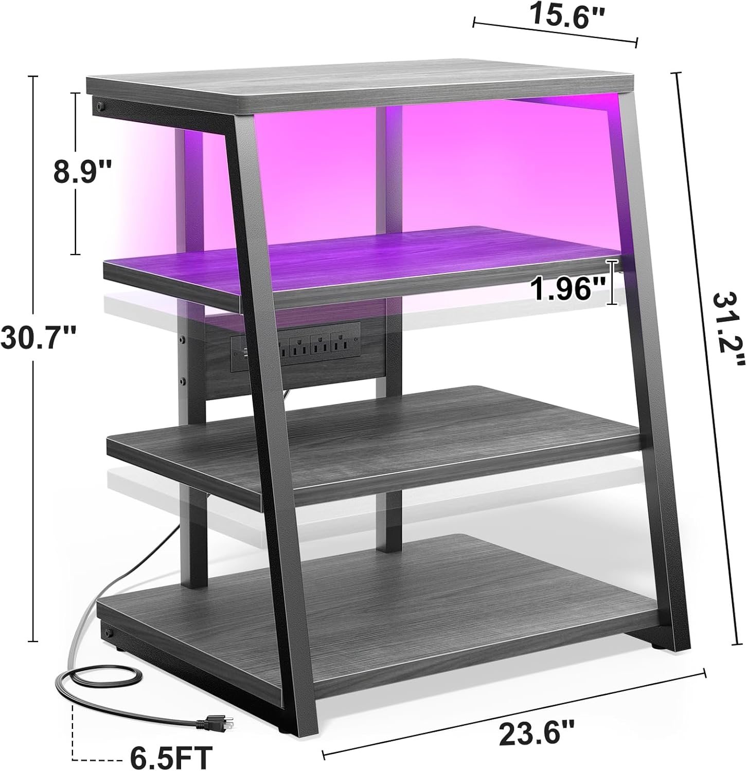 - [ Embedded Power Strips and LED Strip ] The provided power strip of the media stand is easily assembled. It comprises 4 120v connections and 2 USB connectors. A short LED strip comes attached to the bottom of the top shelf and can be controlled with a supplied remote controller which provides several lighting options.