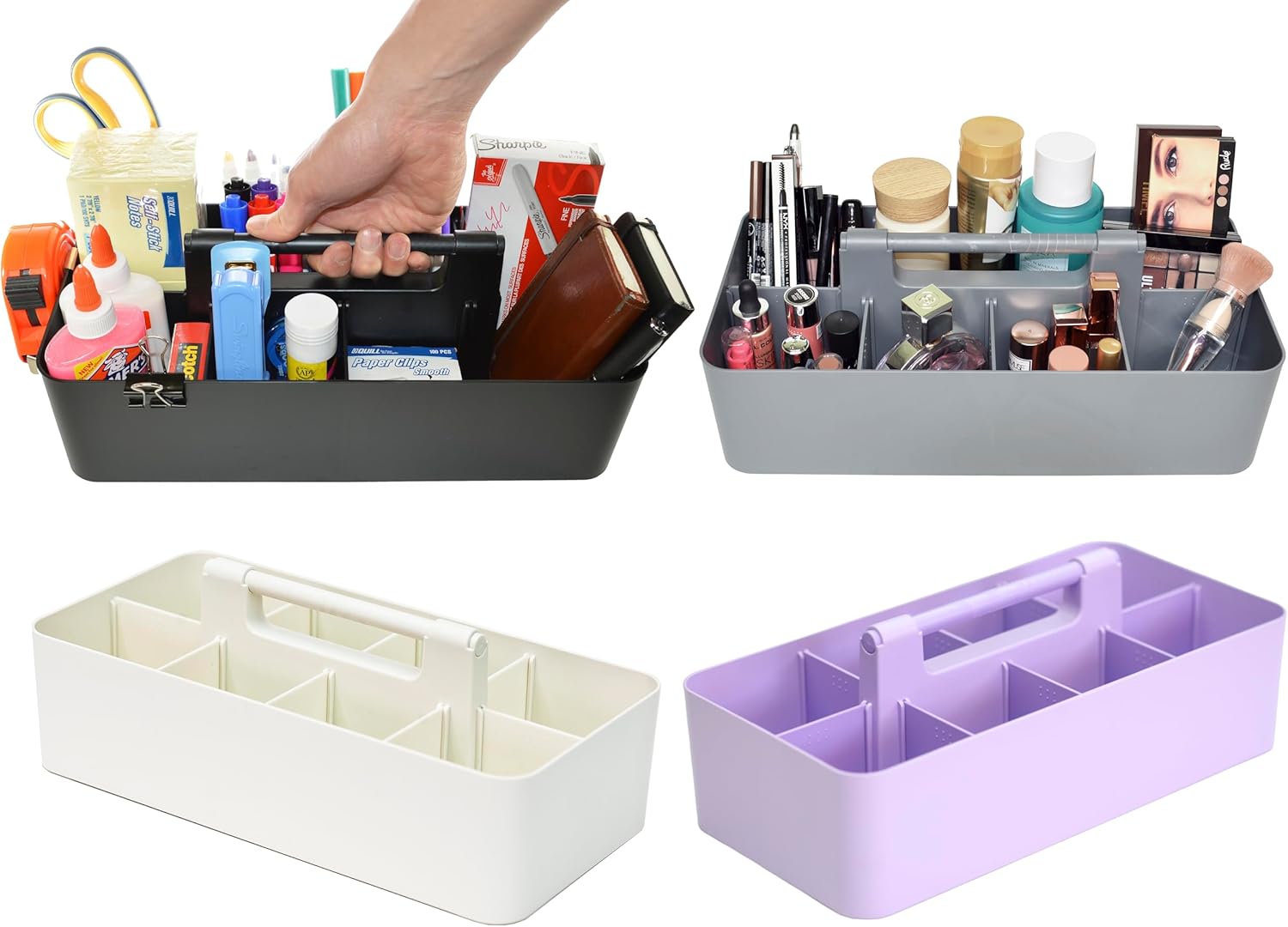 - PORTABLE: Equipped with an easy-carry round smooth handle, this caddy makes transporting goods from shelf to cabinet or desktop a breeze. Just grab and go! The open tops and divided compartments make it easy to see whatβs inside and quickly grab what you need. Use these convenient storage caddies to keep office desk items organized, children's crafting items tidy, and school supplies in check. Perfect for both home and commercial workspaces.