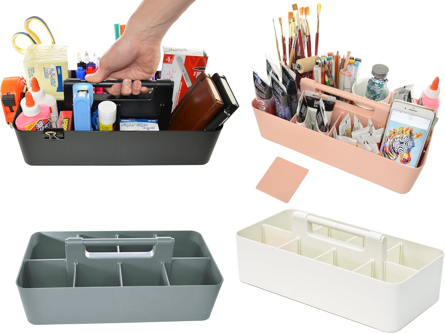 - PORTABLE: Equipped with an easy-carry round smooth handle, this caddy makes transporting goods from shelf to cabinet or desktop a breeze. Just grab and go! The open tops and divided compartments make it easy to see whatβs inside and quickly grab what you need. Use these convenient storage caddies to keep office desk items organized, children's crafting items tidy, and school supplies in check. Perfect for both home and commercial workspaces.