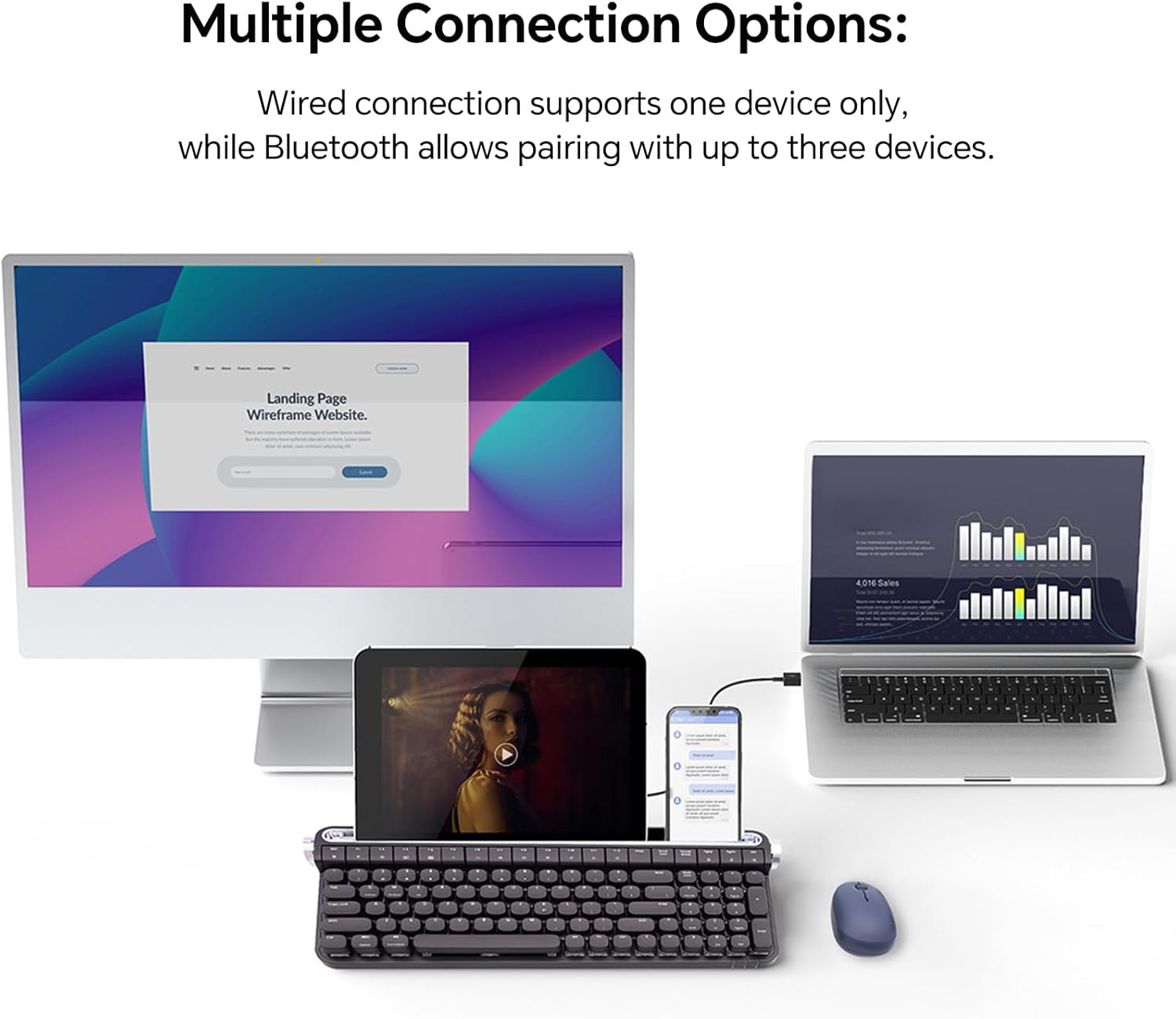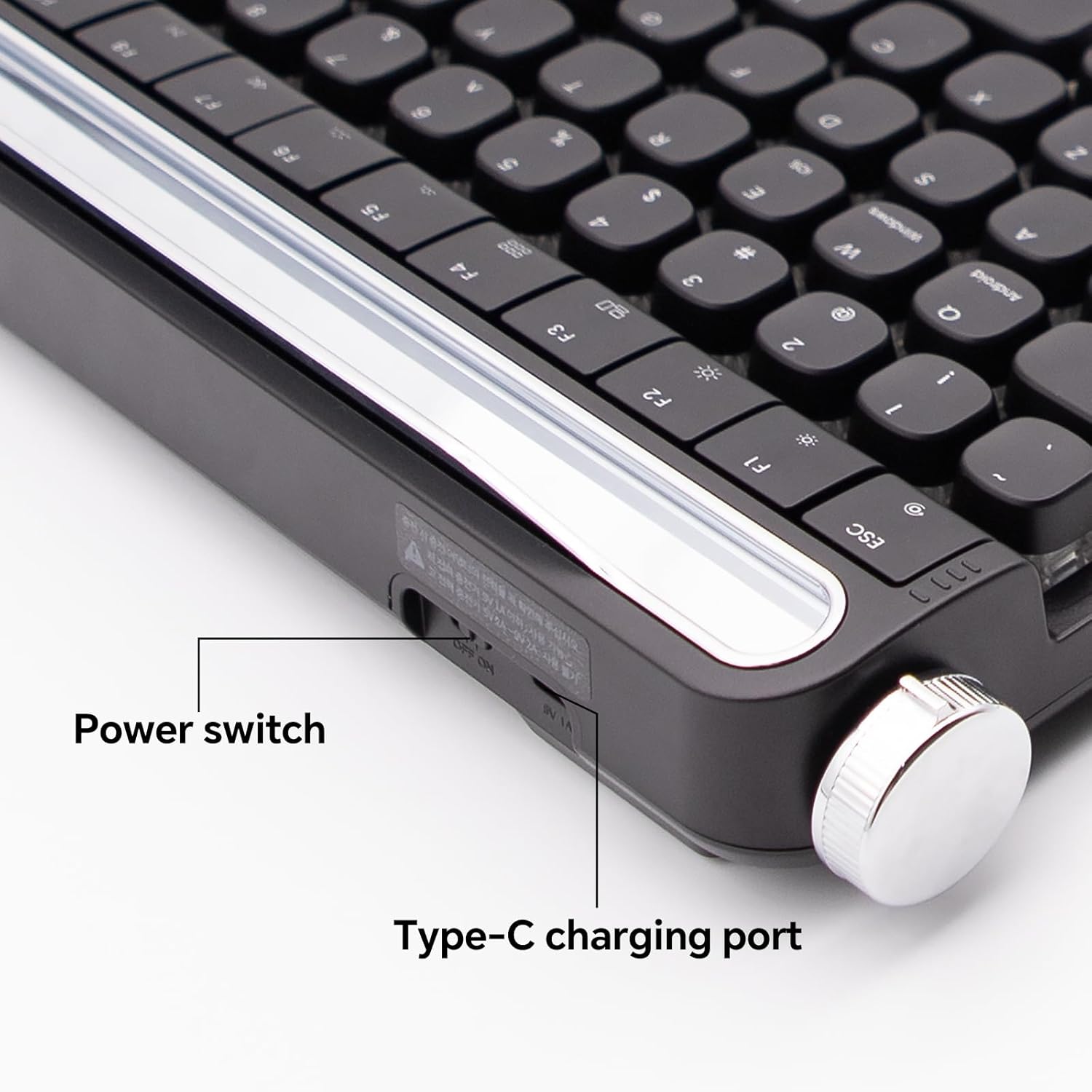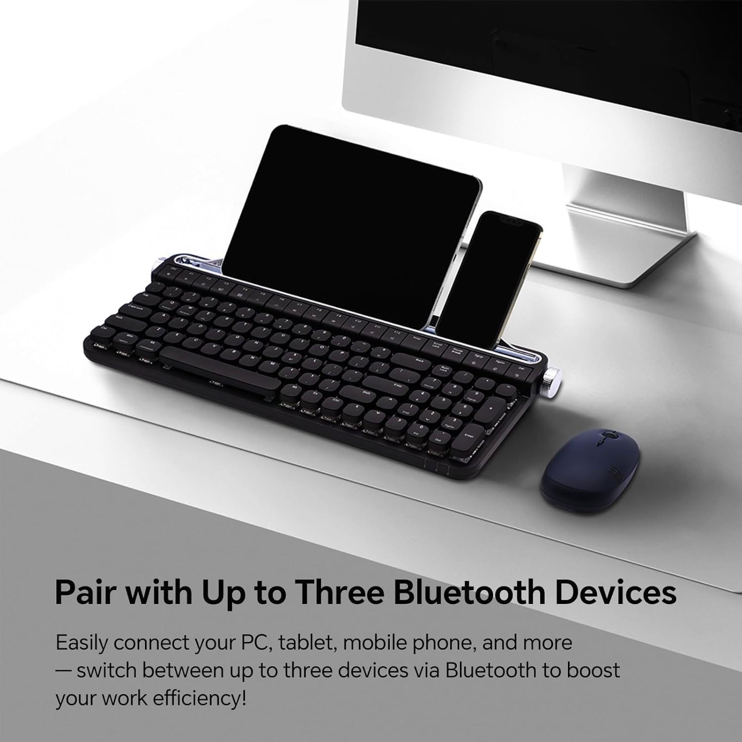 - 【100-Key Typewriter Keyboard with Knob Contro & numpad】 B705 Retro typewriter keyboard is compact, and still has 100 keys (including 12 convenient multimedia keys) and all the functions a typist needs to type efficiently.2 function knobs: Turn the left knob to change the connection channel. Turn the right knob to change the volume.B705 Retro Mechanical Keyboard is versatility and compact design make it ideal for desk accessories and workspace organizers.