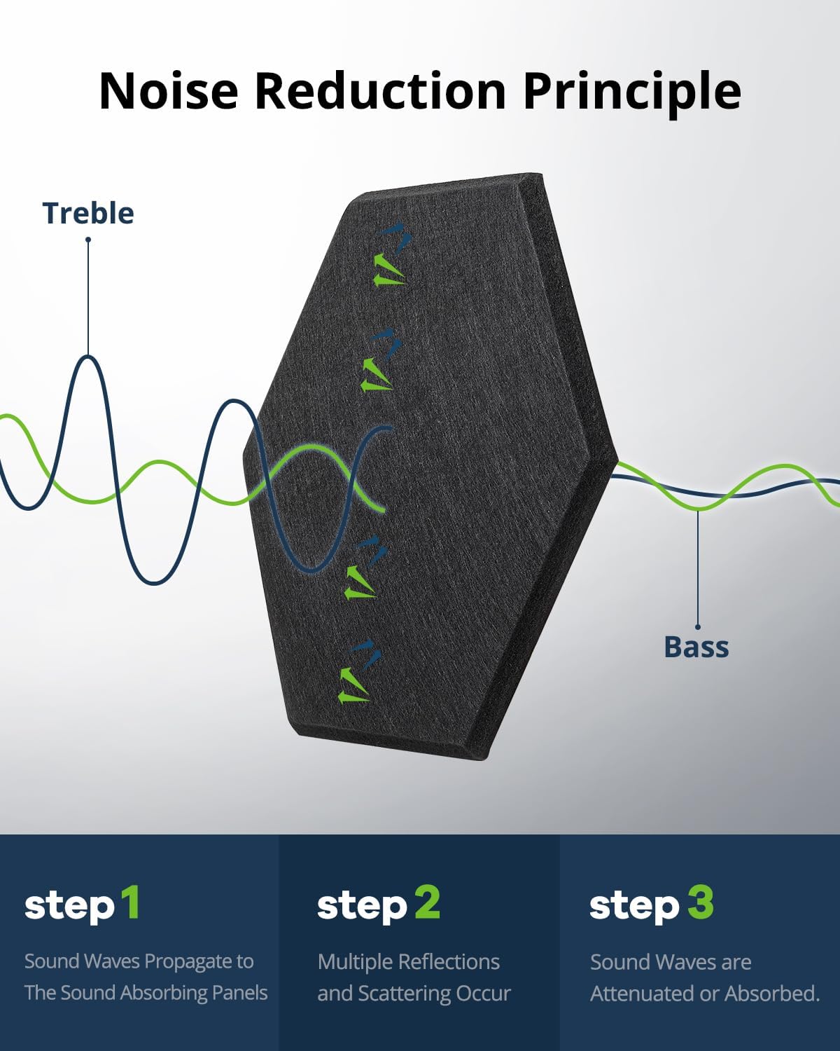- HEXAGONAL STYLISH DESIGN: Add a touch of modern elegance to any room with our hexagon soundproof wall panels. These sleek and stylish sound proof foam panels for walls not only improve sound quality but also serve as eye-catching decorative elements, elevating the aesthetic appeal of your space.