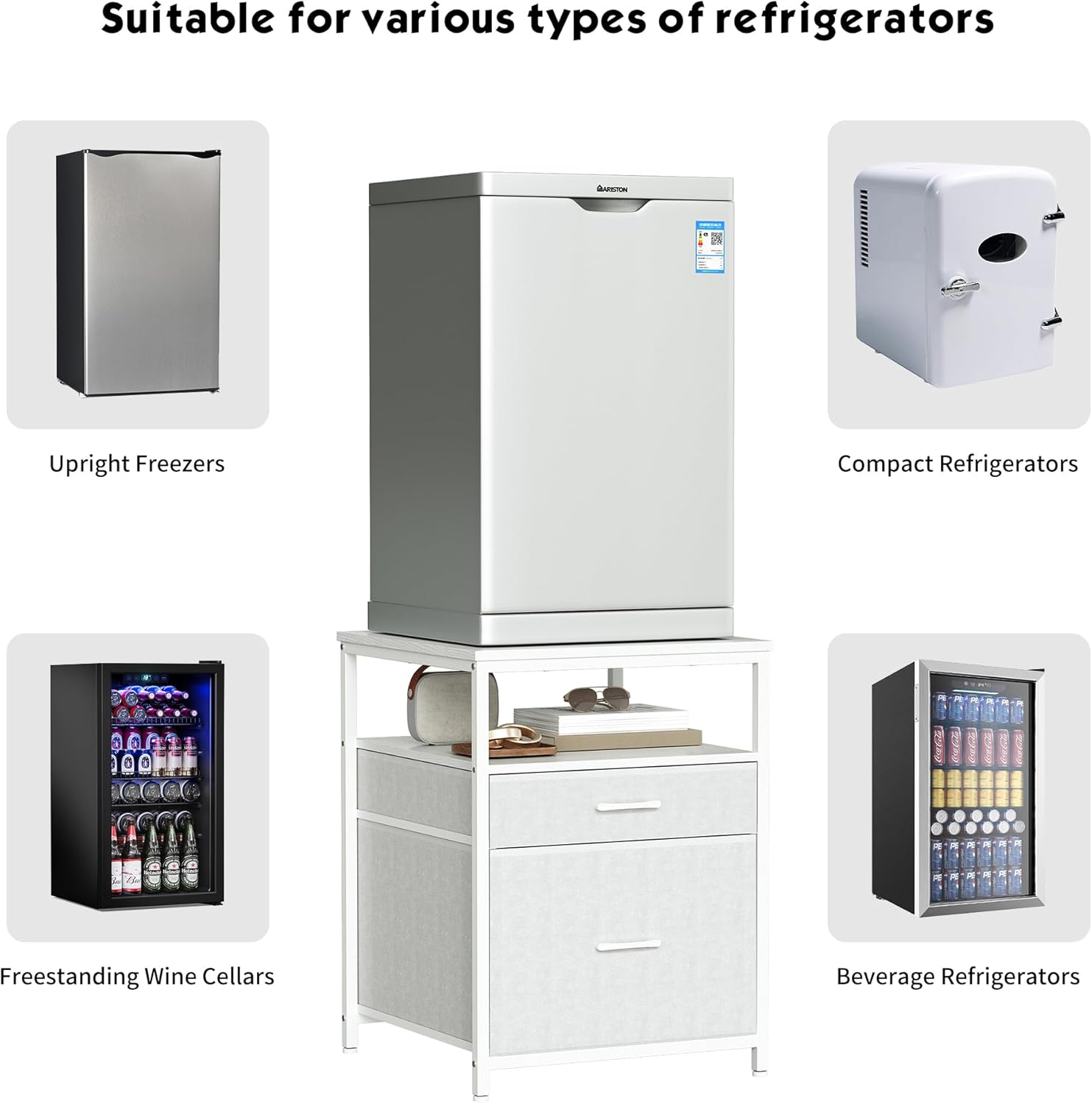 - Three-Tier Storage Design - This mini fridge stand features two fabric drawers (NOT WOOD) and one compartment, offering a total of three storage spaces to perfectly meet your various storage needs. Itβs not just a mini fridge stand with storage; itβs also a great mini fridge organizer, helping you easily keep items around your fridge tidy and organized.
