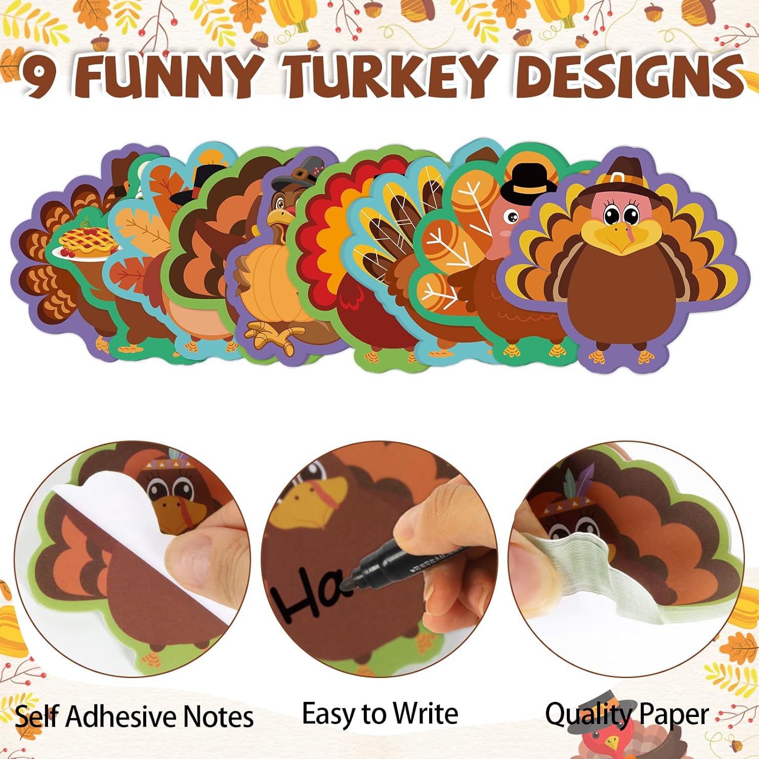 - Easy to Stick and Remove: Thanksgiving memo pads is made of quality paper and adhesive, smooth surface, smooth writing, can be re-sticked and will not leave adhesive marks, these fall turkey sticky notes can be firmly stuck on books, computers, desks, walls, refrigerators, etc