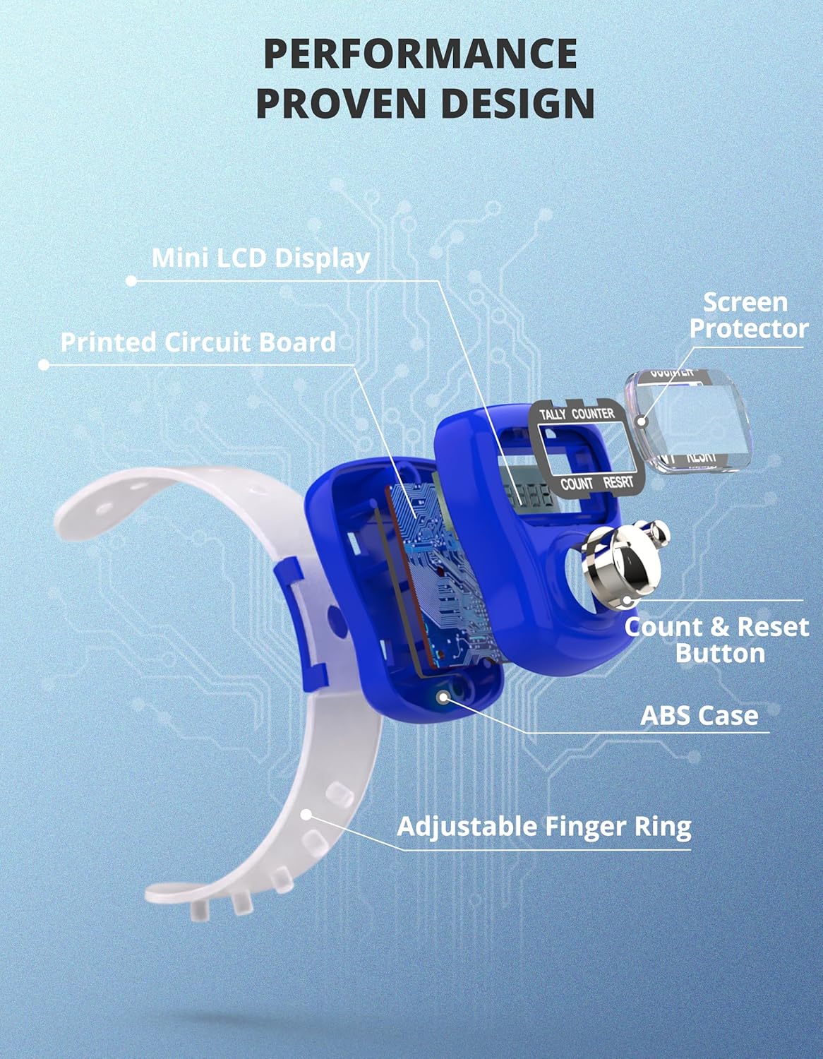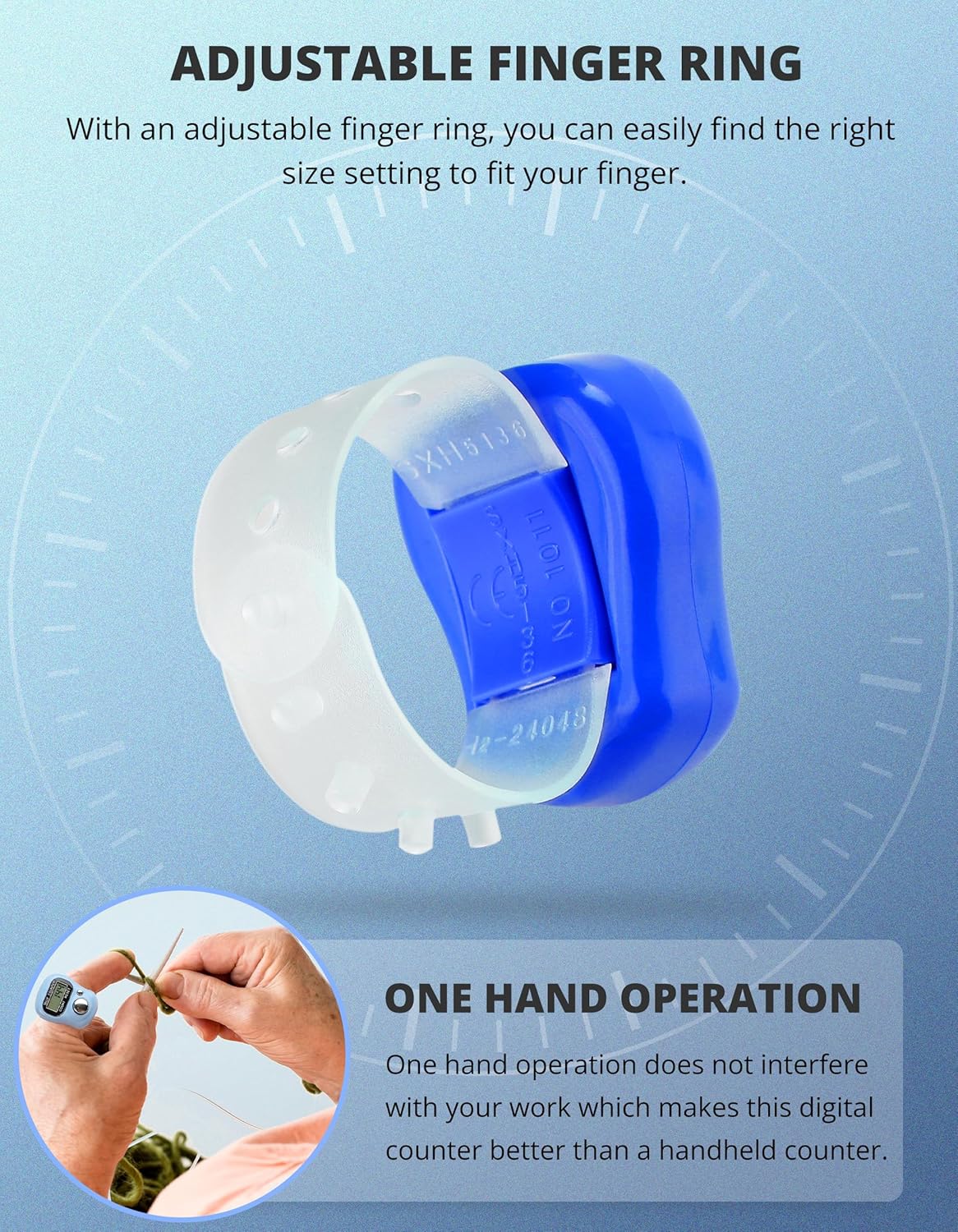 - One Hand Operation: Small & compact design, one hand operation does not interfere with your work which makes this digital counter better than a handheld counter. With an adjustable ring, you can easily find the right size setting to fit your finger.