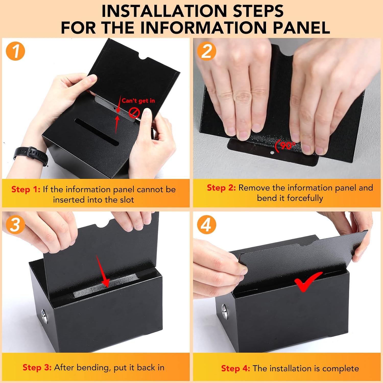 - Metal Suggestion Box User Guide:1. To prevent loss during shipping, the keys are pre-placed inside the locked suggestion box.Retrieval Steps:β Tilt the box towards the letter slot.β‘ Gently shake the box to work the keys out through the letter slot.(Key size is designed specifically for the slotβeasy retrieval guaranteed.)2. Information Panel Installation Guide Initial Setup:Locate the insert tab on the metal information panel .Bend the tab along the fold line to 90β120 degrees