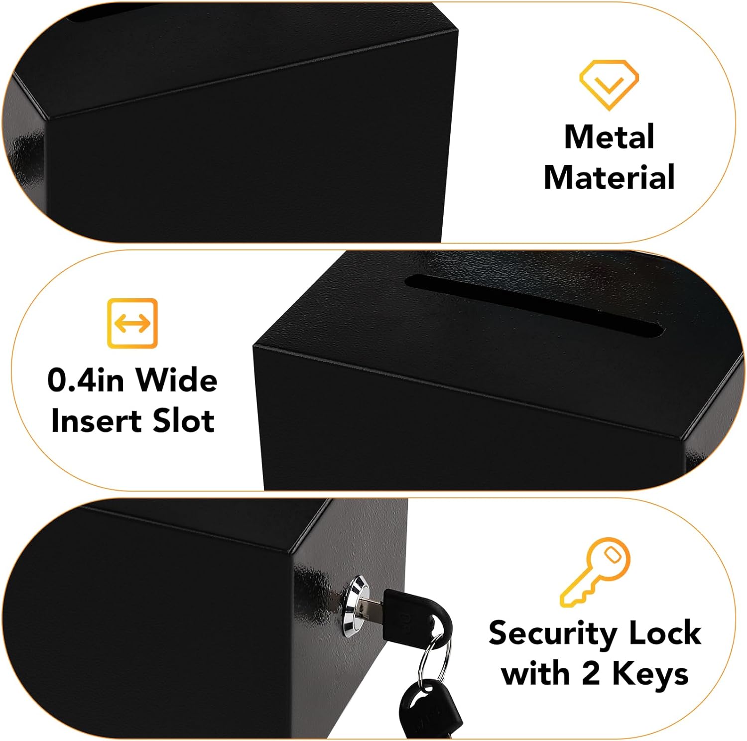 - Package Includes: This black metal box with a waterproof sleeve,two keys, a support plate that can be inserted into the sleeve, You can use it very easily.Security locking mechanism: The donation box is equipped with a security locking mechanism, two keys, and a sturdy structure to ensure your safety